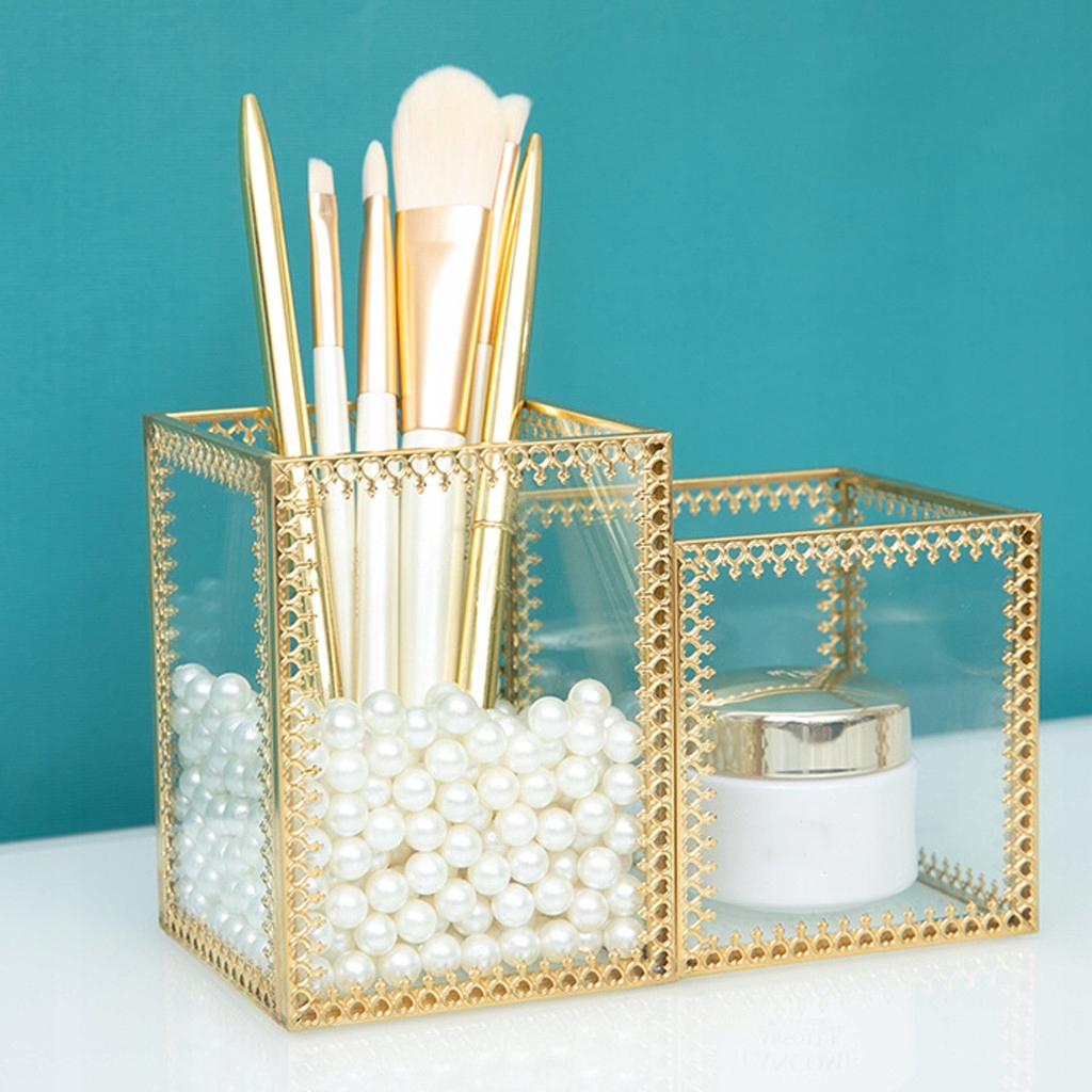 Унікальна комбінація двох квадратних стовпців та чудового кольору, блискуча золота рама та прозорі скляні панелі створюють старовинний стиль. , стильний і елегантний. та інші офісні товари в офісі чи офісі. Його можна розмістити на стільниці або комоді, завдяки якому стільниця буде більш акуратною і матиме більше місця. Прозорий скло змушує вас легко знайти те, що вам потрібно. випадки.