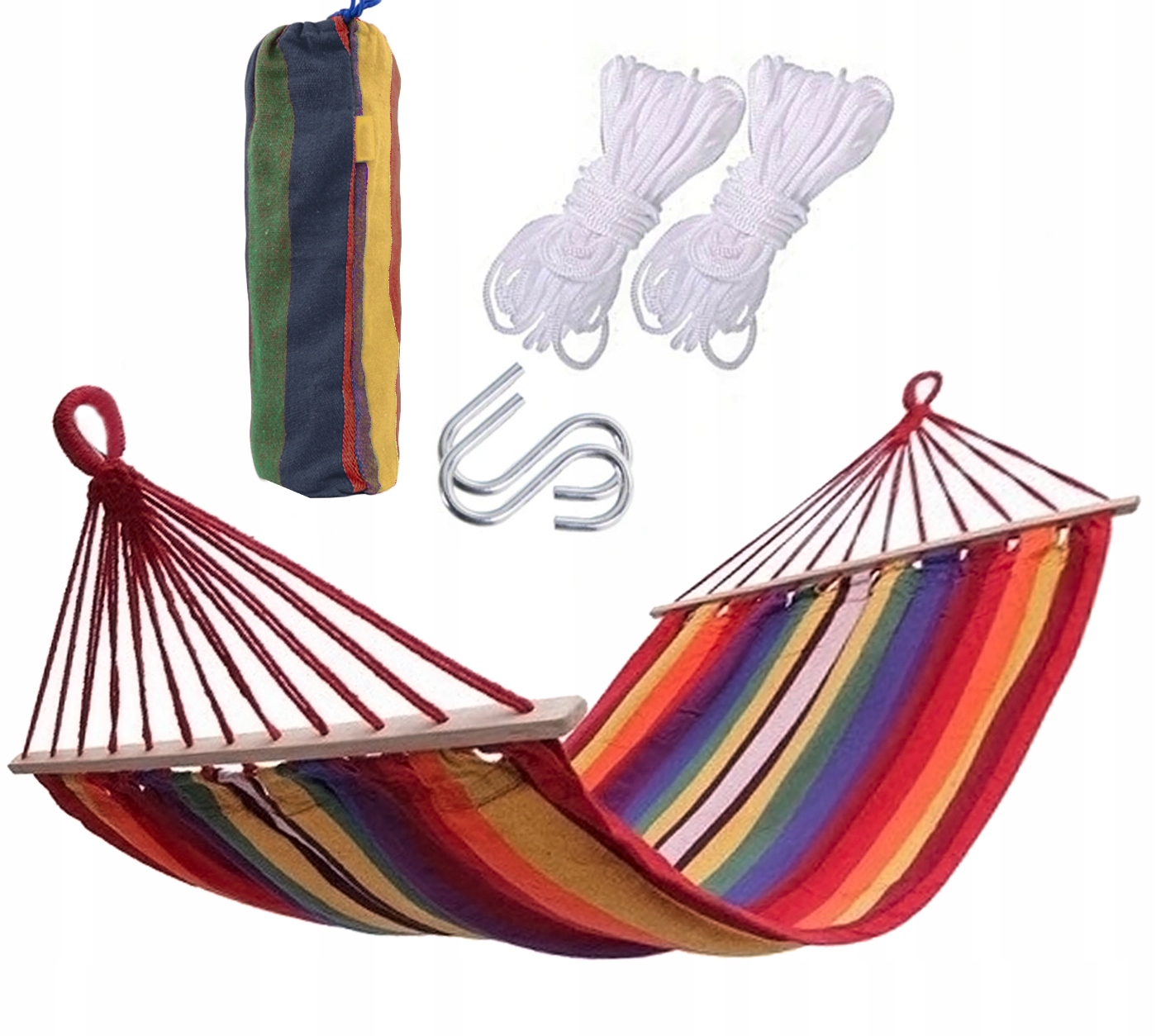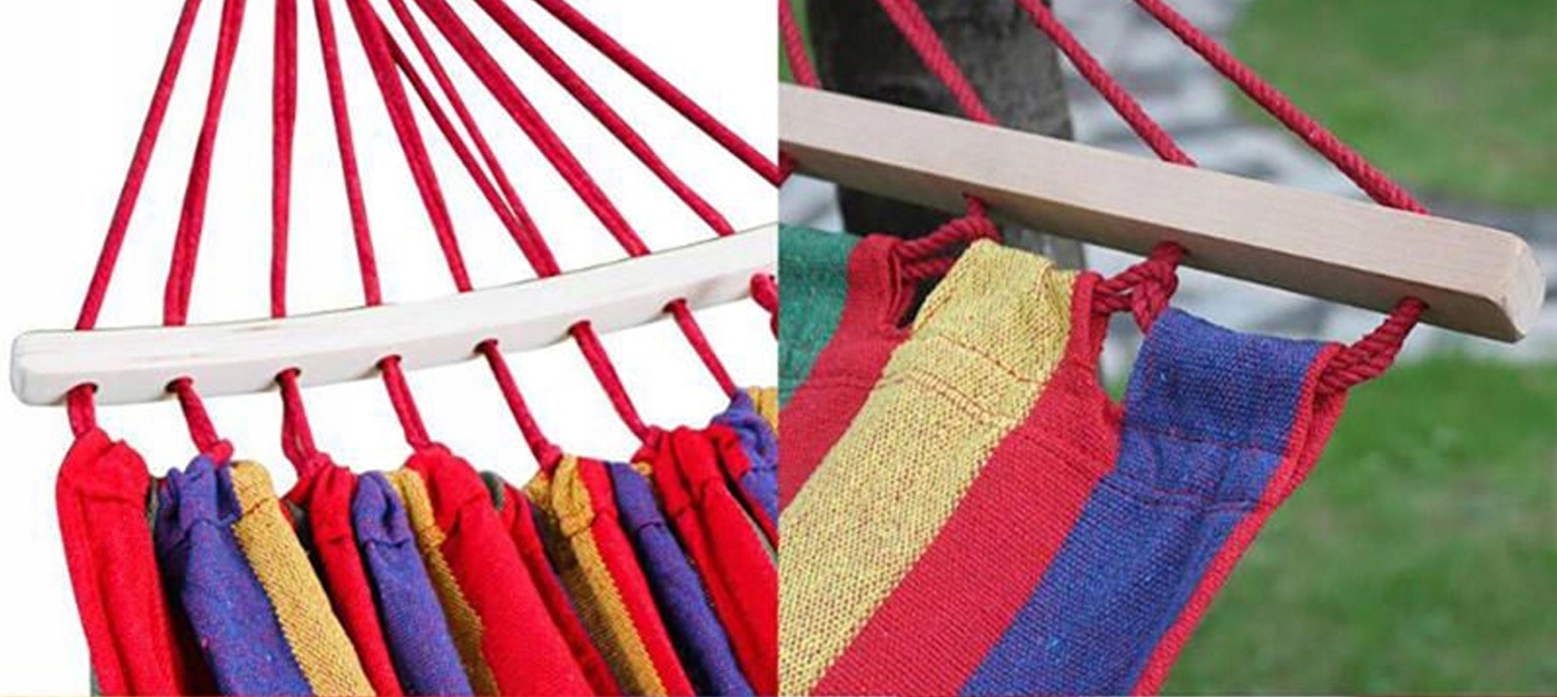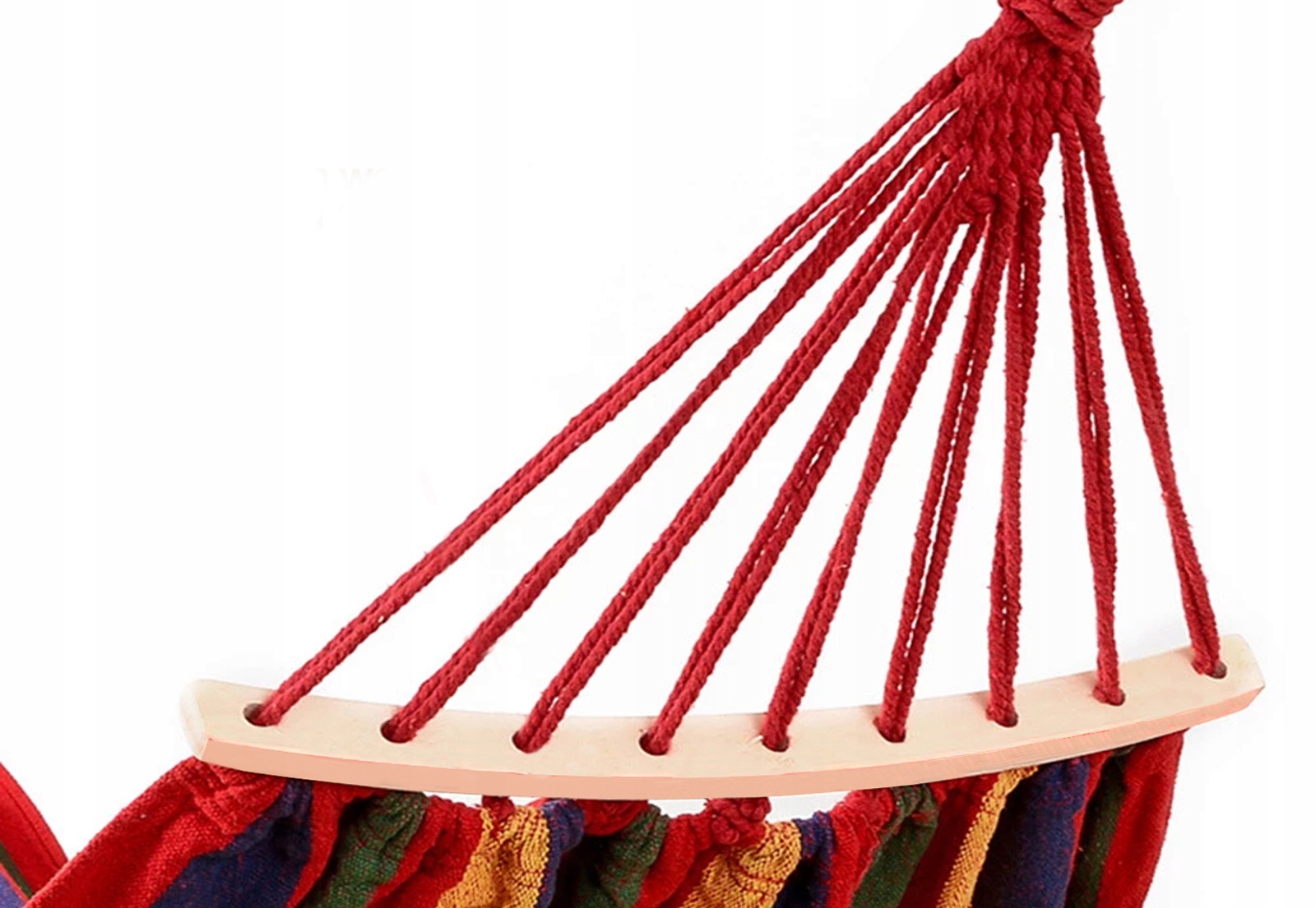 Гамак виготовлений з матеріалів найвищої якості. Щільна бавовна з поліестером гарантує відмінну міцність і повітропроникність тканини. Красиве поєднання кольорів є додатковою декоративною перевагою гамака. Товсто сплетені мотузки та міцні ручки підвищують комфорт та безпеку використання.