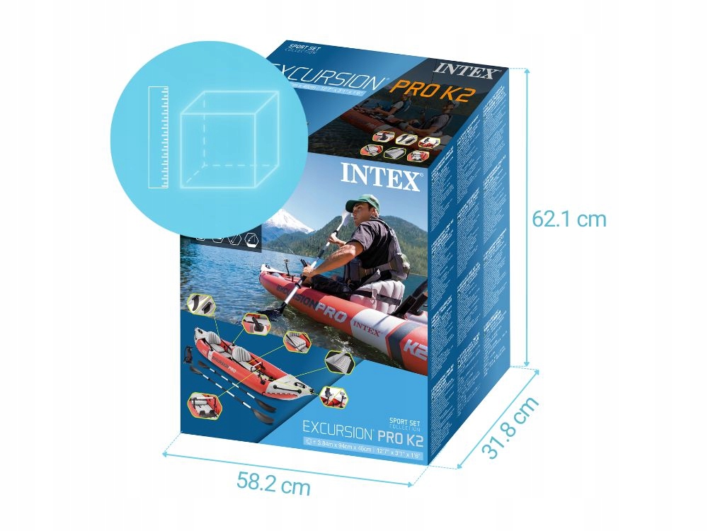 Він має вбудовані тримачі вудок з обох боків - ви можете рибалити без рук. Він має знімний і регульований монтажний кронштейн для додаткових аксесуарів, таких як система GPS або ехозонд. Транспортувати каяк зовсім не проблема, навіть якщо він надутий - ручки спереду та ззаду забезпечують легкий спосіб перенести його на сушу або пляж. У носовій частині байдарки є відсік для зберігання, де можна зберігати водонепроникну сумку, яка входить в комплект. Для більшої безпеки використання каяк складається з двох незалежних повітряних камер. Він був оснащений двома парами алюмінієвих весел і поршневим насосом. Додатково в набір входить ремонтна латка. Каяк Excursion Pro має все необхідне, щоб насолодитися днем на озері чи річці.