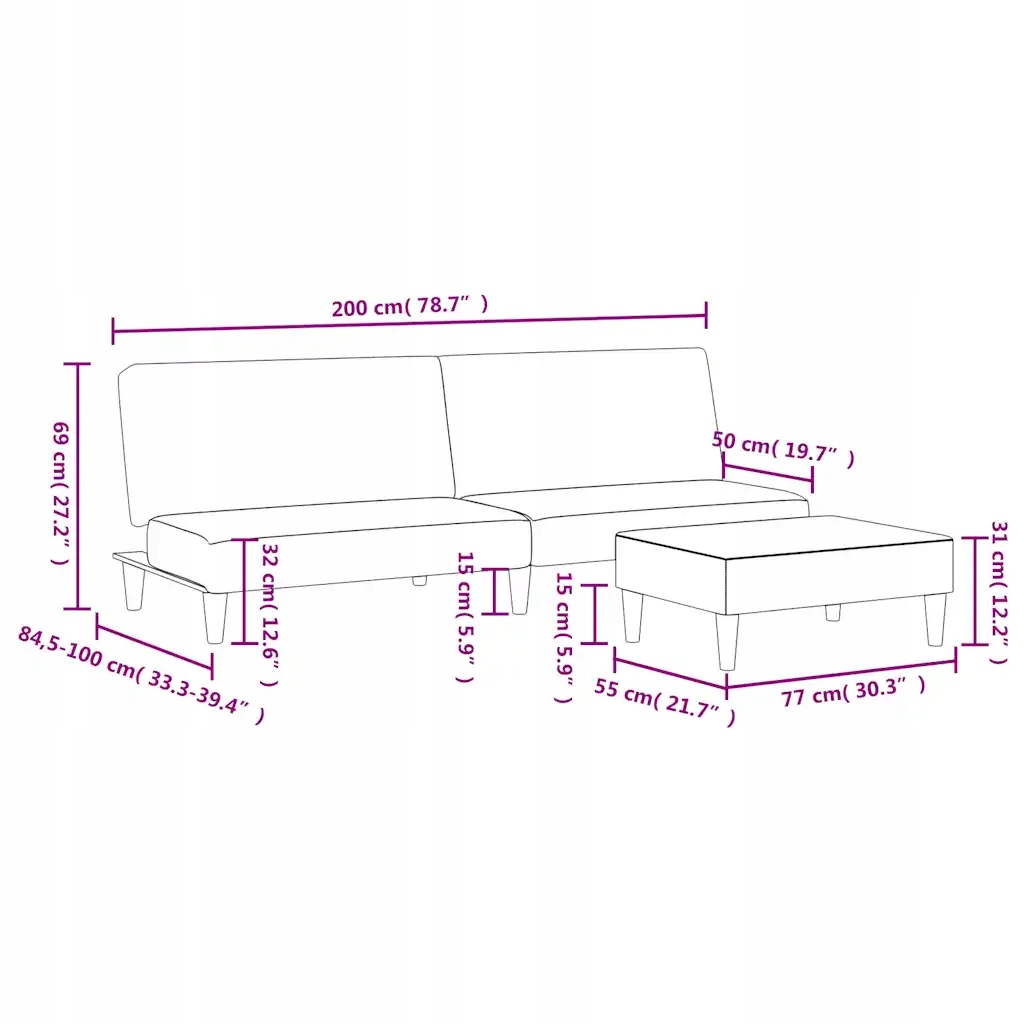 - Загальні розміри: 200 x 84,5 x 69 см (Д x Ш x В)