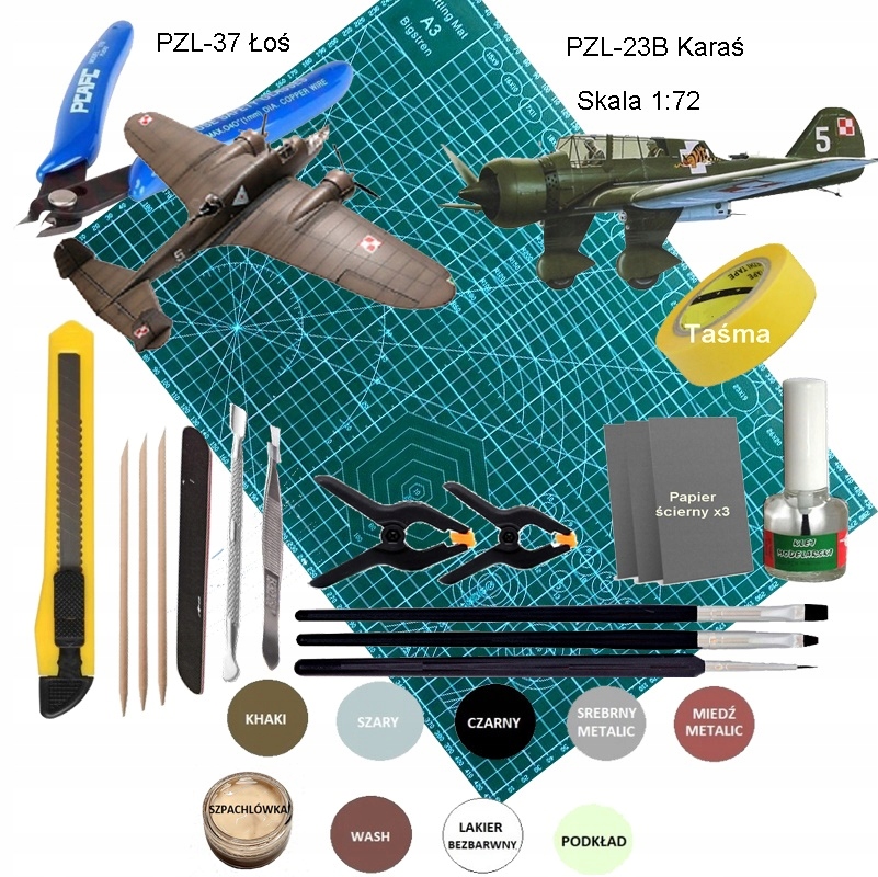 2 моделі літаків польської авіації часів Другої світової війни: PZL 37 Łoś та PZL 23B Karaś + фарби, клей, пензлі, інструменти.