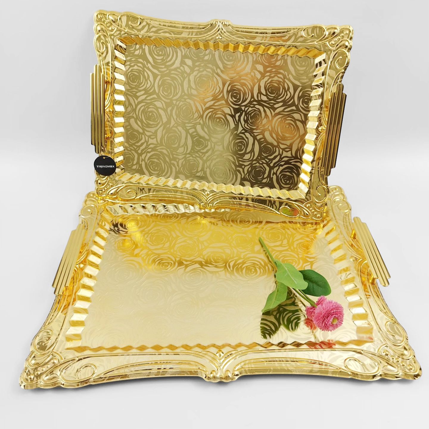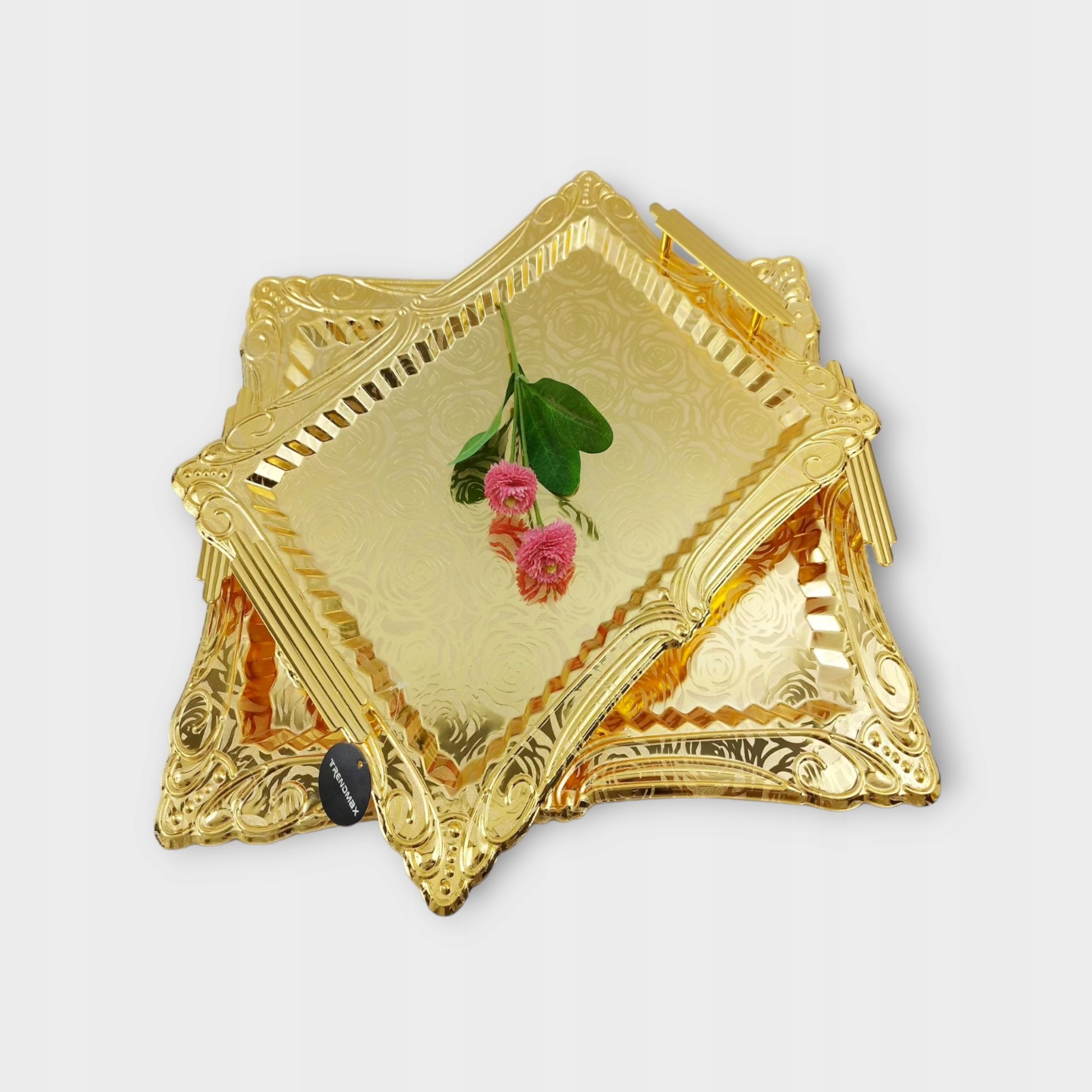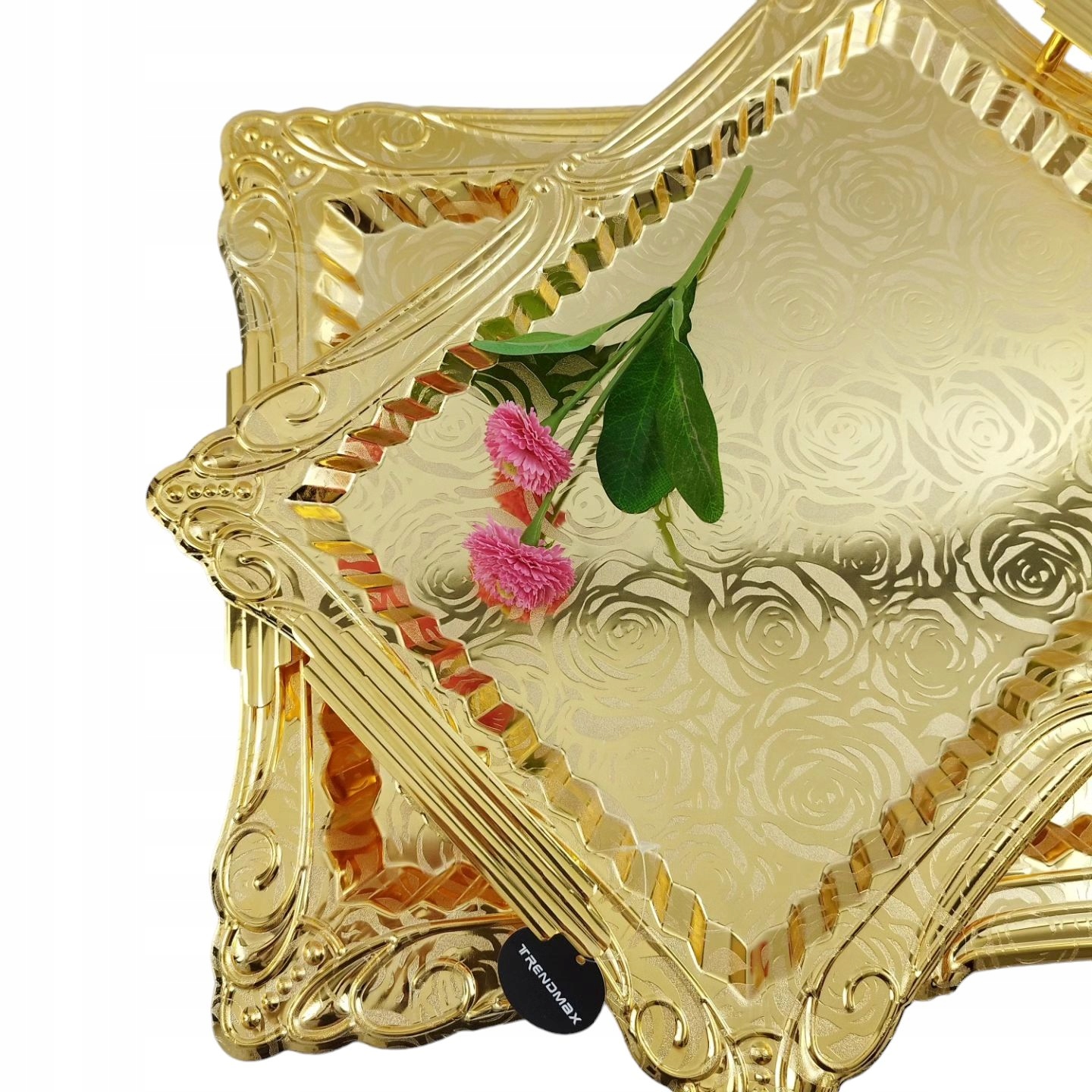 Набір підносів з нержавіючої сталі золотистого кольору, красиво прикрашених орнаментом.