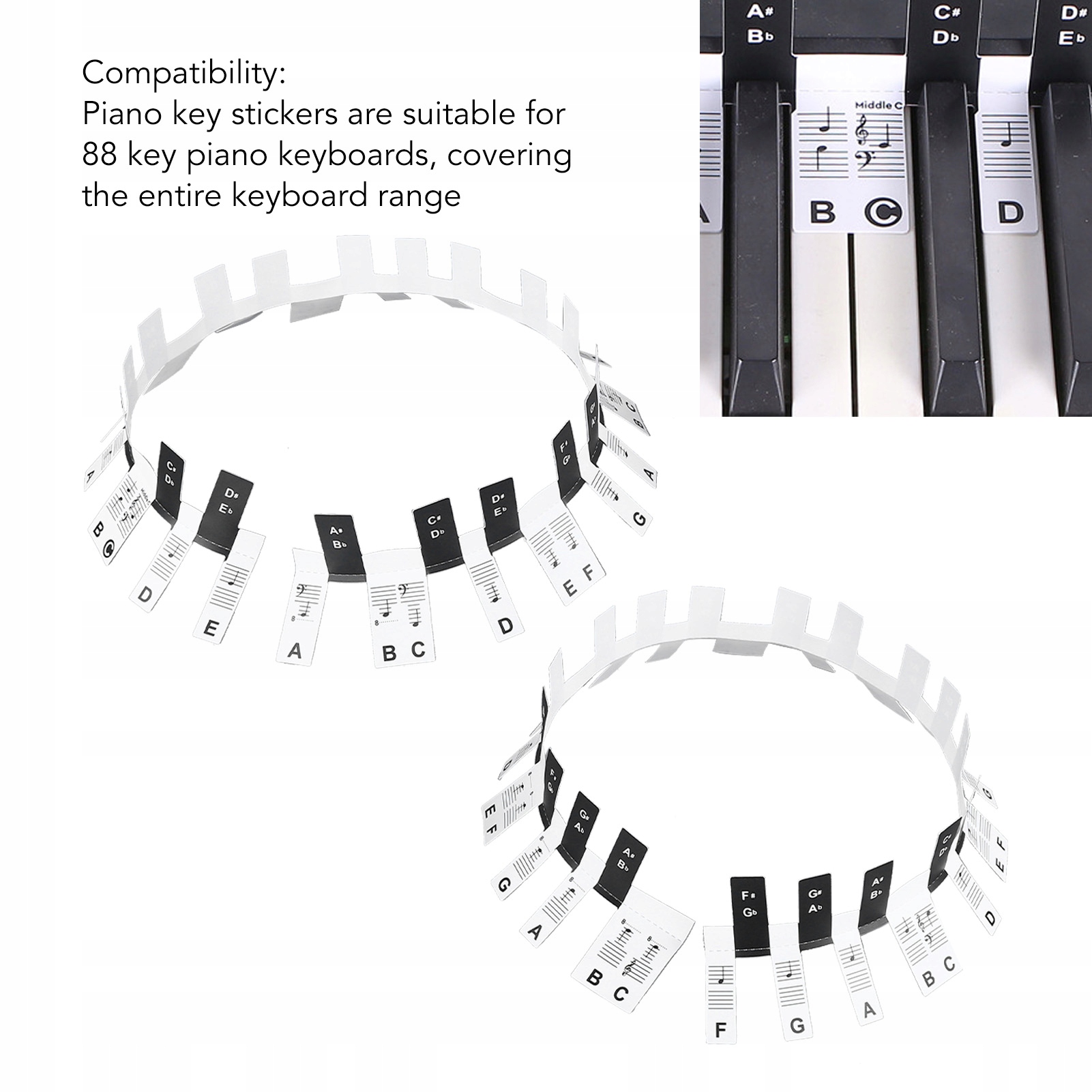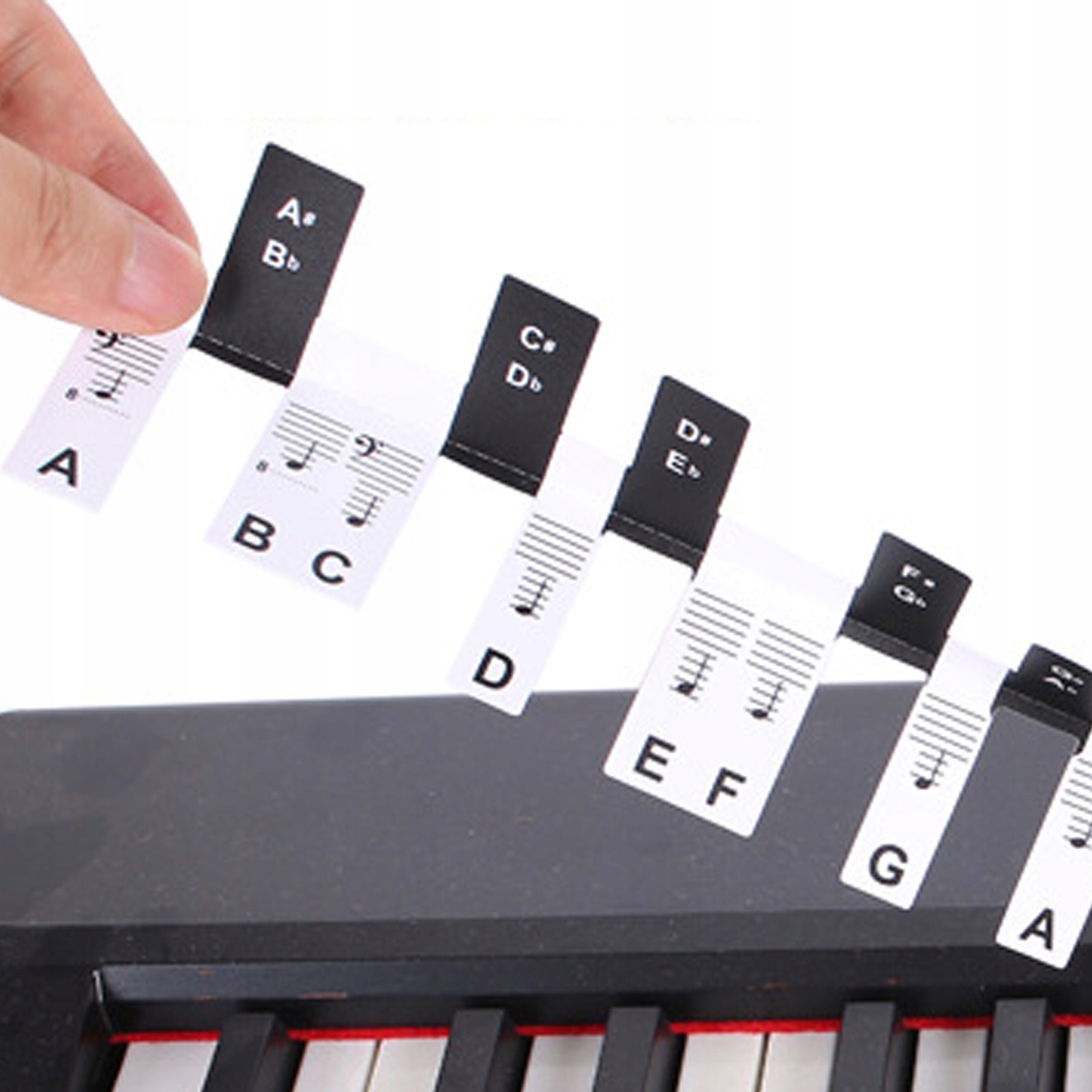 Функція: 1. Легко вчитися та використовувати: наклейка з 88 фортепіанними клавішами має знімну конструкцію, тому ви можете легко приклеїти її на клавіатуру на фортепіано. Він надає точні поради для початківців та допомагає їм швидко навчитися та запам'ятати нотатки та ваги.