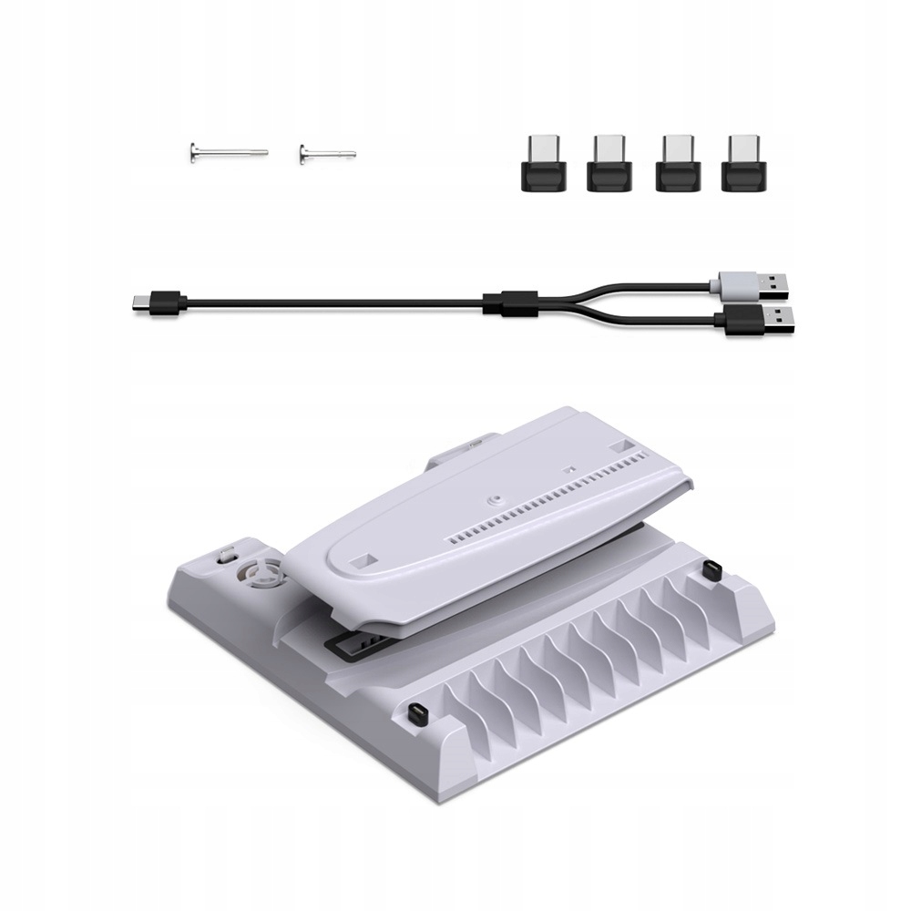 - У набір входить 2xUSB-USB-C кабель, який потрібно під’єднати до консолі (2 USB-роз’єми) і до підставки (USB-C-штекер), а також 2 кріпильні гвинти залежно від версія консолі прикрутіть консоль до підставки для більшої стійкості