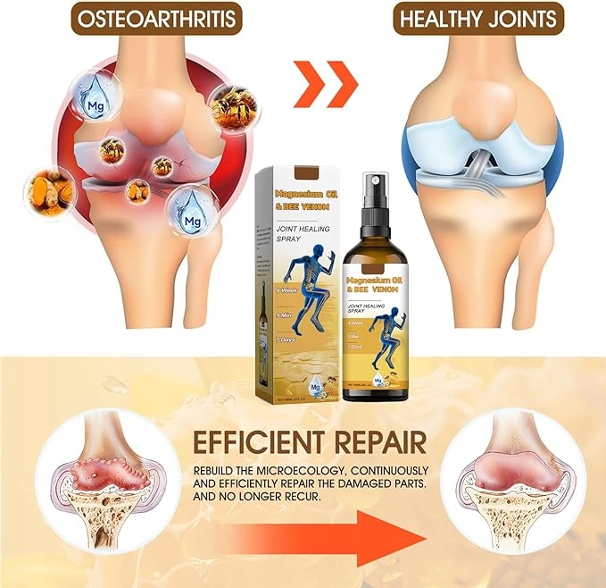 - 【Натуральна для суглобів】Наш лікувальний спрей з магнієвою олією від бджолиної отрути поєднує в собі силу бджолиної отрути, меду та ефірних олій, щоб заспокоїти суглоби, покращити гнучкість, розслабити м’язи та збільшити рухливість