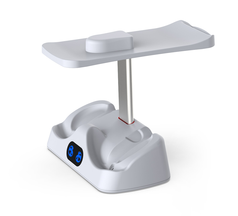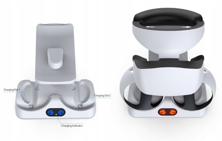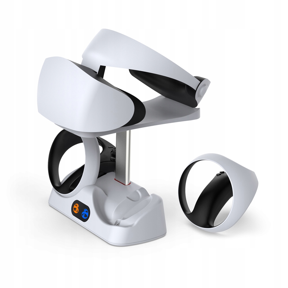 Підставка дозволяє розмістити окуляри PlayStation VR2 і 2 контролери в одному місці, заощаджуючи простір і впорядковуючи обладнання. Підставка виготовлена ​​з міцного пластику, тому може використовуватися роками. Під підставкою є гумки для стабілізації підставки. Станція має 2 місця для контролерів PS VR2, що дозволяють їх заряджати, і тримач для окулярів VR2. Завдяки світлодіодним індикаторам ми знаємо стан зарядки планшетів і контролерів.