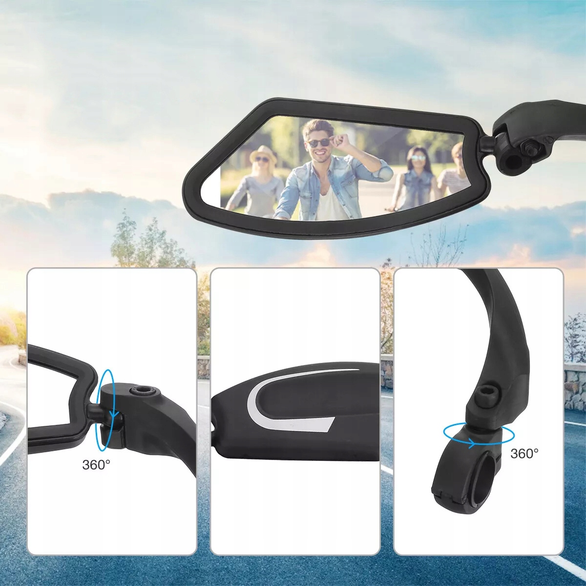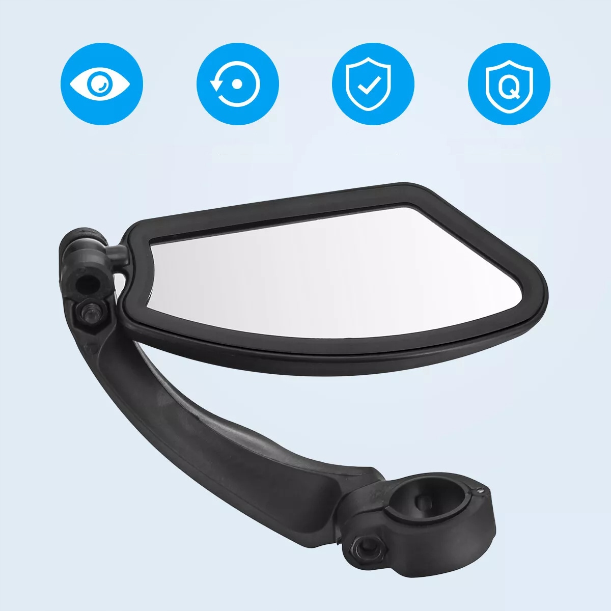 Розроблена з гнучкою поворотною пряжкою на 360 ° і може бути відрегульована під будь -яким кутом, якщо це необхідно. Дзеркало з обертанням 360 °, щоб відрегулювати положення дзеркала до правильного кута виду на задній частині.