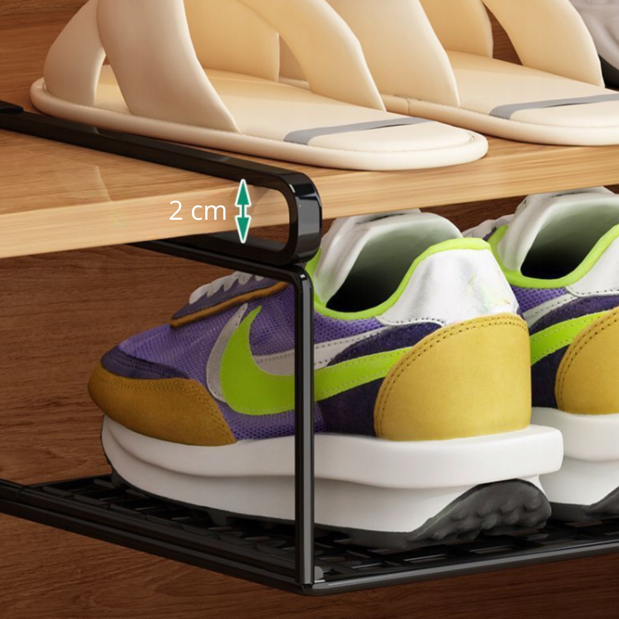 ☑ збільшити ємність гардеробу без додаткових меблів! Організатор дозволяє ефективно розвивати місце під полицею , що ідеально підходить для невеликих просторів. Ви можете легко встановити його без свердління - просто просуньте його на полицю. Завдяки сильній металевій сітці взуття або аксесуари добре провітрюються, що допомагає підтримувати їх у ідеальному стані.