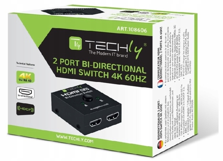 Повна відповідність стандартам HDMI 2.0 і HDCP 2.2, що забезпечується двонаправленим 2-портовим комутатором HDMI 2x1 або 1x2 Techly IDATA HDMI-22BI2, гарантує надійність і найвищу якість операції. Комутатор дозволяє передавати відео з роздільною здатністю 4K, підтримує 3D-відео з роздільною здатністю 1080p і глибиною кольору, об'ємний звук 7.1 і аудіо в форматах DTS-HD, Dolby TrueHD, DTS, Dolby-AC3, DSD. Просто підключіть кабелі HDMI до своїх пристроїв і перемикача HDMI, щоб отримати бажану конфігурацію 2x1 або 1x2. Пристрій не потребує зовнішнього джерела живлення, живиться від джерел сигналу HDMI і не потребує програмного забезпечення чи спеціального налаштування.