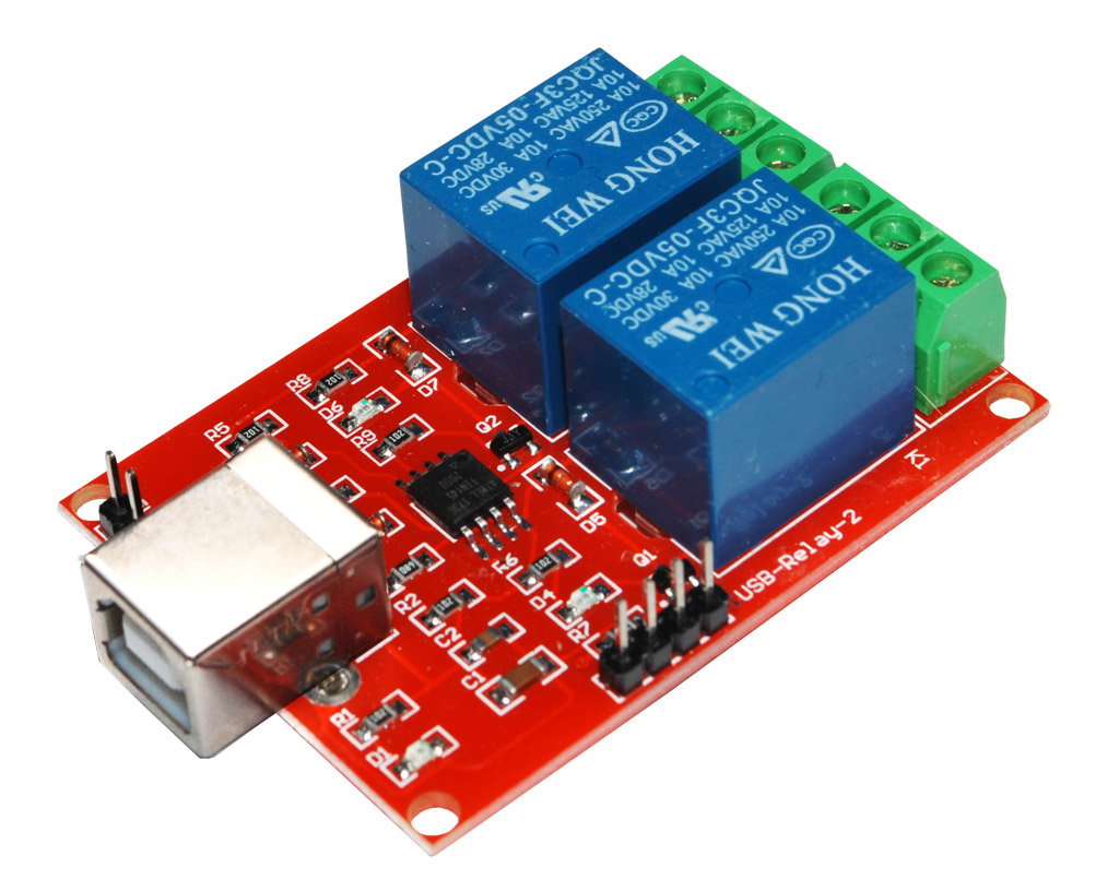 2-канальний релейний модуль невеликих розмірів, керований USB-портом комп'ютера або іншого пристрою.