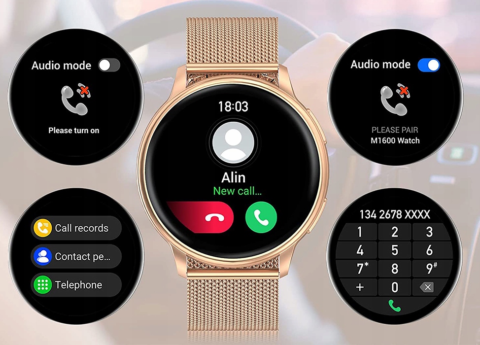Годинник для викликів Bluetooth підтримує відповідь /завершення вхідних дзвінків, набирайте номер за допомогою сенсорного екрану, зберігайте свою адресну книгу та переглядайте записи дзвінків. Оригінальні голосові дзвінки високої чіткості роблять спілкування більш реальним і заощаджують зусилля.