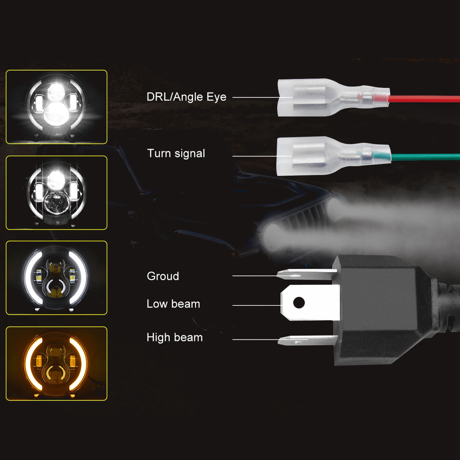 - Ця 7-дюймова світлодіодна фара з білим дальнім/нижнім світлом, покажчиками повороту DRL і жовтим світлом є надзвичайно яскравою та довговічною.