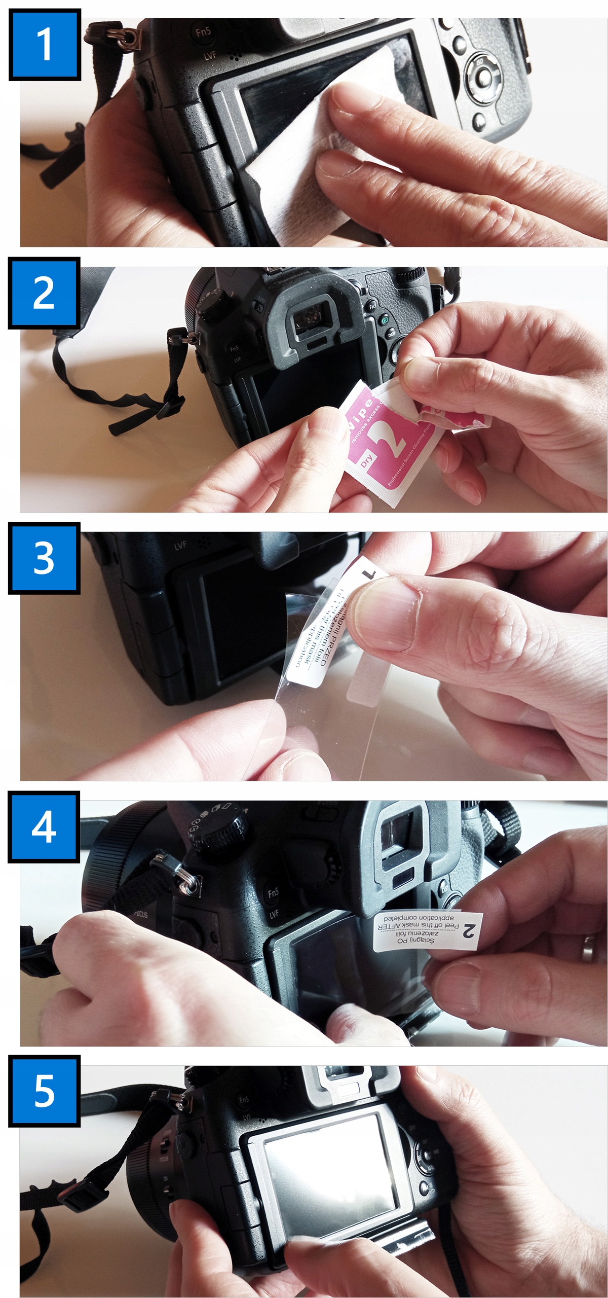 Щоб було ще простіше - ось проста процедура наклеювання захисної плівки на екран (на фотографіях вище ми показали процес наклеювання плівки VITU на екран камери).