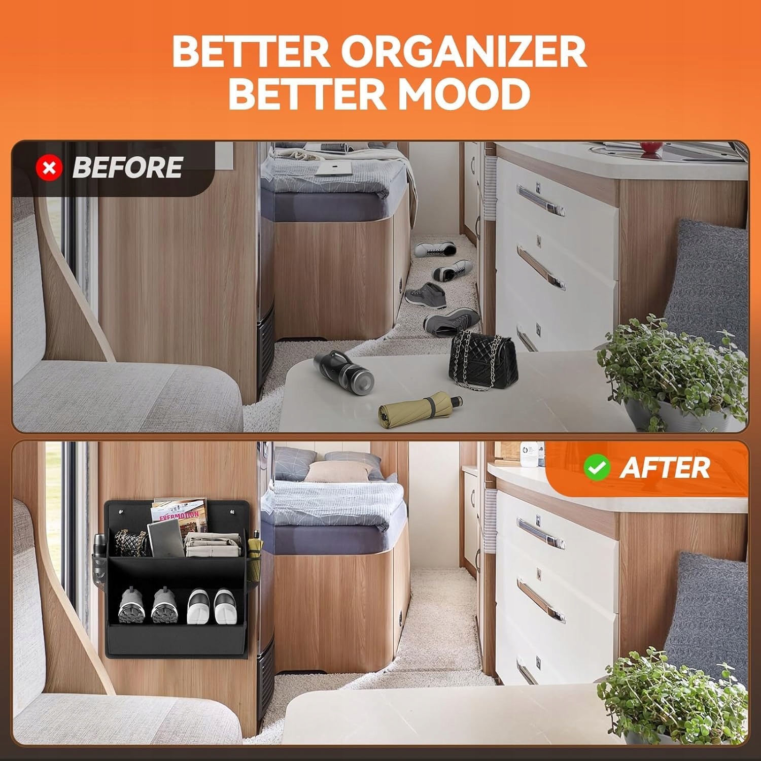 - Економія місця. Ця стійка для взуття, розроблена з тонким профілем, ідеально вписується в обмежений простір вашого кемпера. Еластичні ремені на кожній кишені надійно тримають взуття на місці, гарантуючи, що воно залишається на місці, навіть коли кемпер їде по вибоїстій дорозі. Це надійний компаньйон у ваших походах, зберігаючи ваше взуття в порядку протягом усієї подорожі.
