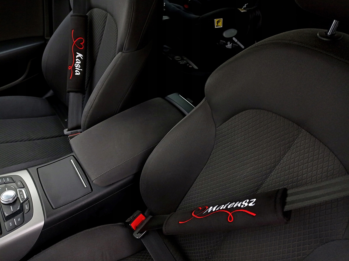 Нижче представлені чохли на ремені з красивого та міцного матеріалу алькантара. Накладки чудово виглядають в автомобілі, а стильна та унікальна вишивка додає їм характеру. На пояси надіті накладки, під ними є губка, яка не ковзає вгору-вниз. Монтаж дуже простий - ми встановили липучки, які потрібно просто розстібнути і встановити виріб на ремені. Матеріал м'який і приємний на дотик, тому лямки приємно сидять на плечі. Якщо у вас є проблема з тим, що ремінь безпеки кусає шию і доставляє незручність, а відрегулювати його в автомобілі вже недостатньо, наші накладки стануть ідеальним вирішенням цієї проблеми. Крім того, красива вишивка на них додасть делікатну порцію жвавості салону автомобіля.