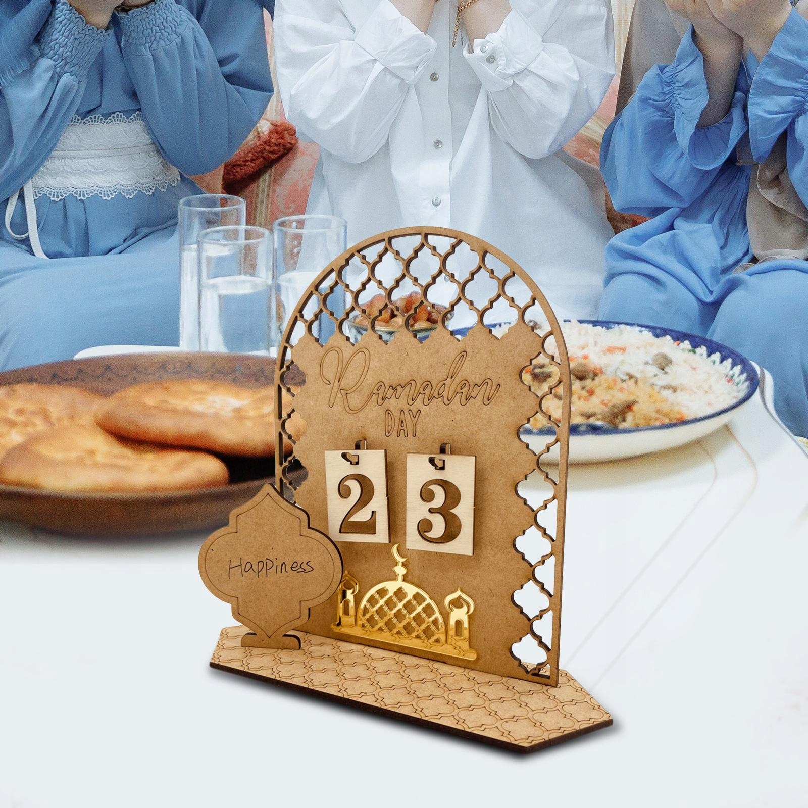 Виготовлений із високоякісних дерев’яних матеріалів, календар Ід Мубарак прикрашений дуже детальними улюбленими елементами Ід Мубарак.