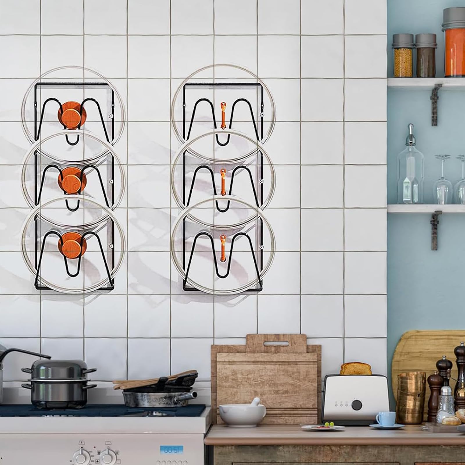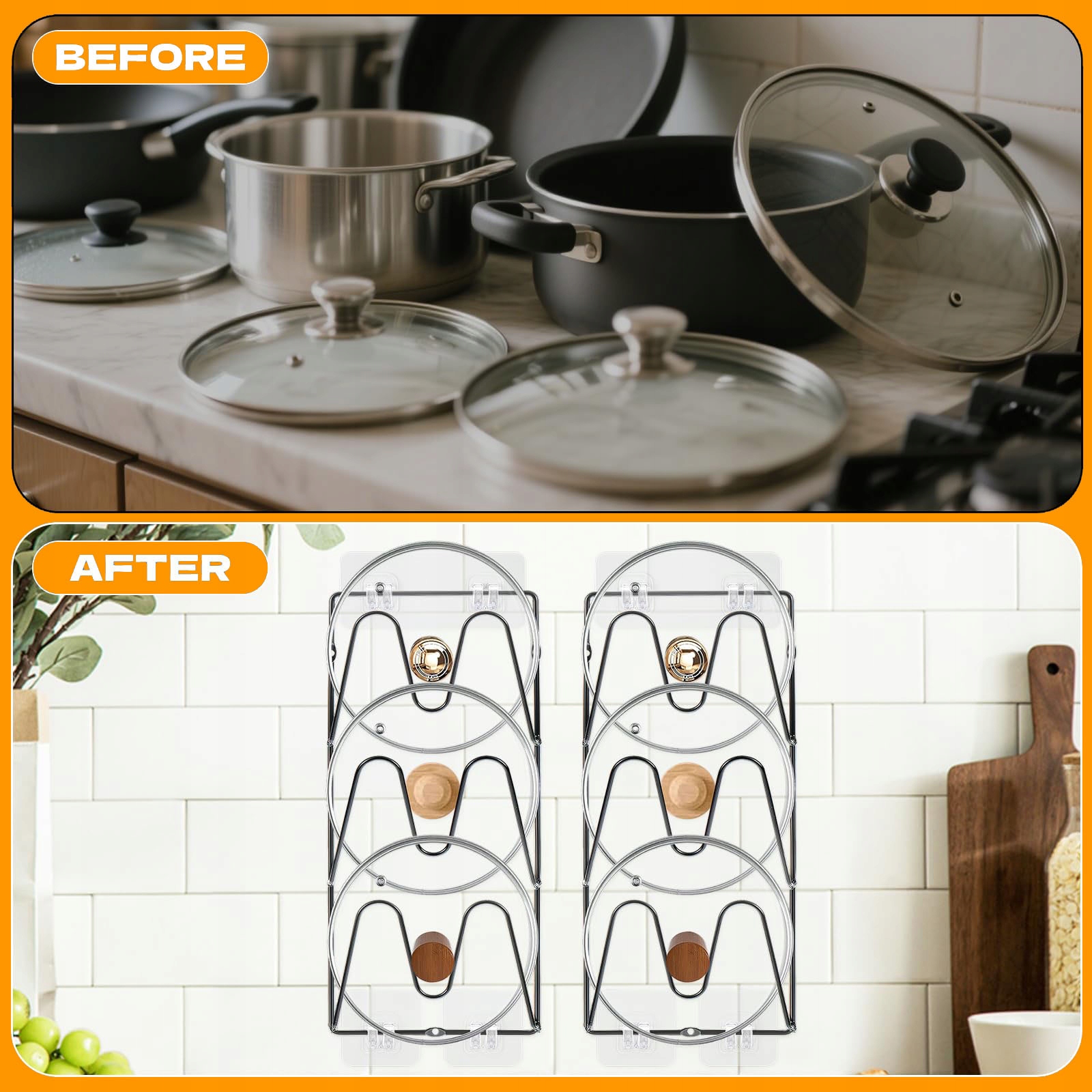 Завдяки компактному дизайну тримача для кришки ваша захаращена кухонна стійка й кришки від каструль упорядковуються. Його можна встановити над раковиною, біля плити, на стільницю, на стіну чи дверцята шафи.