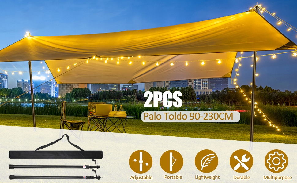 Алюмінієві палиці легкі та зручні для транспортування, підходять для походів, туризму, кемпінгу, гамаків, укриттів або навісів. Виготовлені з високоякісного алюмінієвого сплаву, вони дуже стійкі до вітру та зносу. Професійний для великих брезентів або наметів із сонцезахисним козирком.