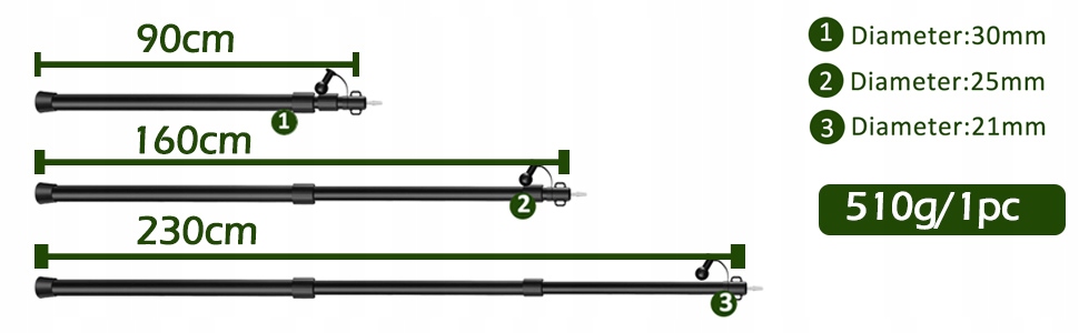 Довжина в складаному стані коливається від 0,9 м (найкоротша) до 2,3 м (найдовша). Можна встановити та зафіксувати будь-яку висоту в межах цього діапазону.