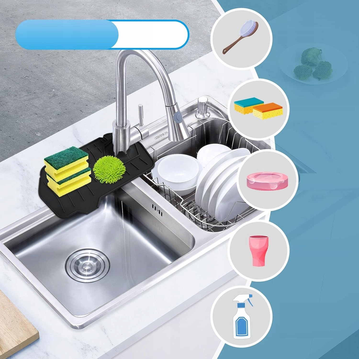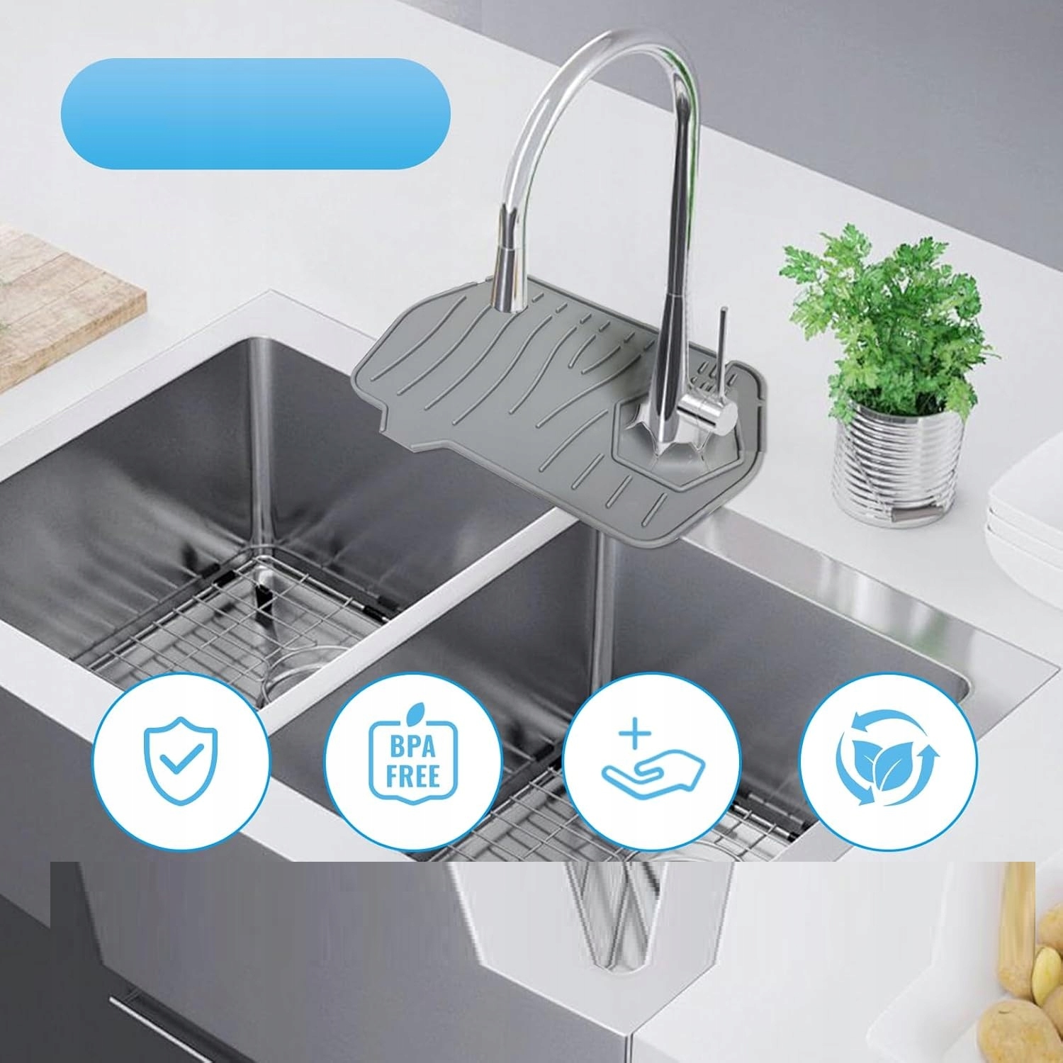 Килимки виготовлені з високоякісного силікону, стійкого до води та температури. Гнучкий матеріал адаптується до більшості форм кранів і раковин, а профільовані канавки ефективно відводять воду назад у камеру раковини.