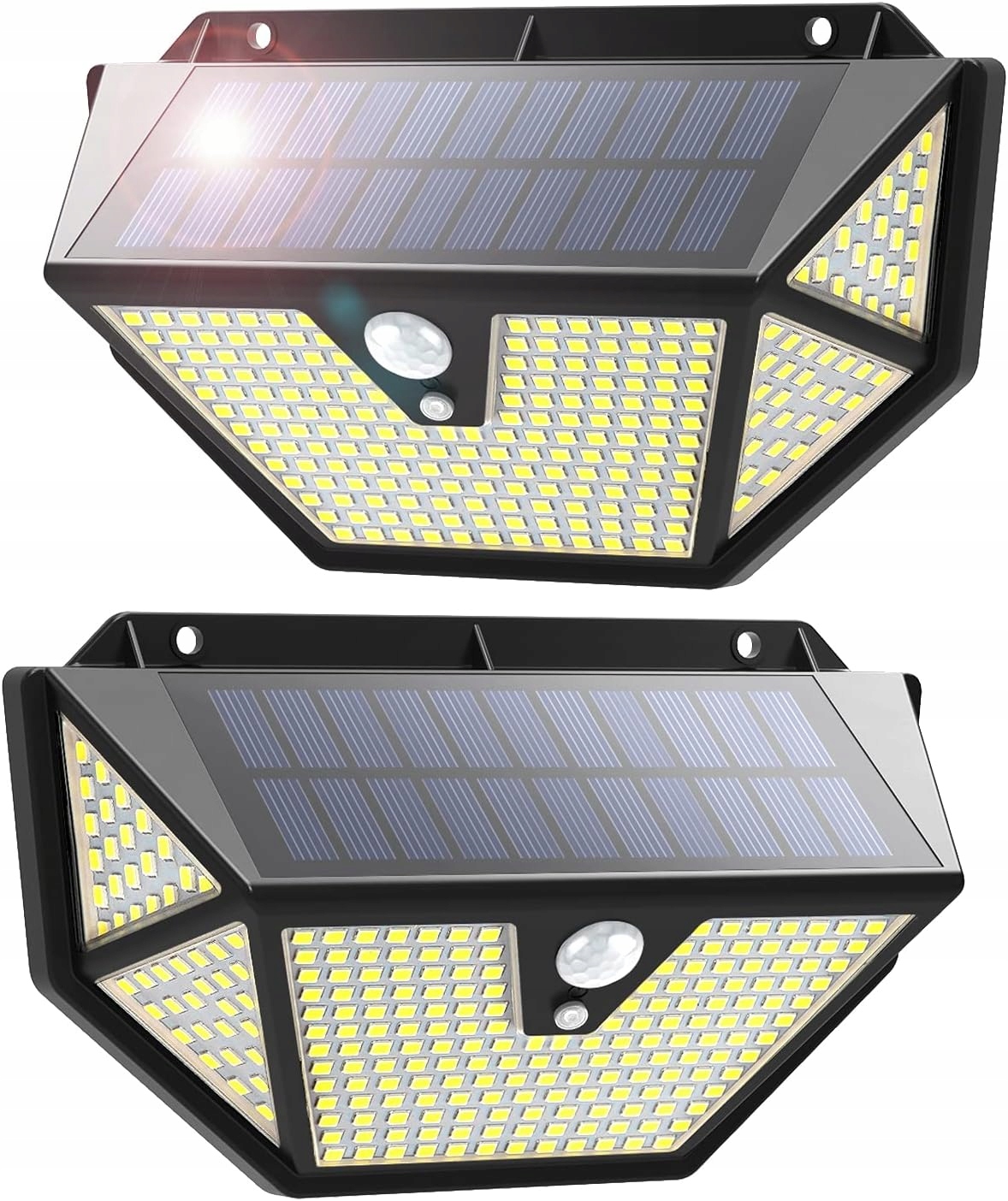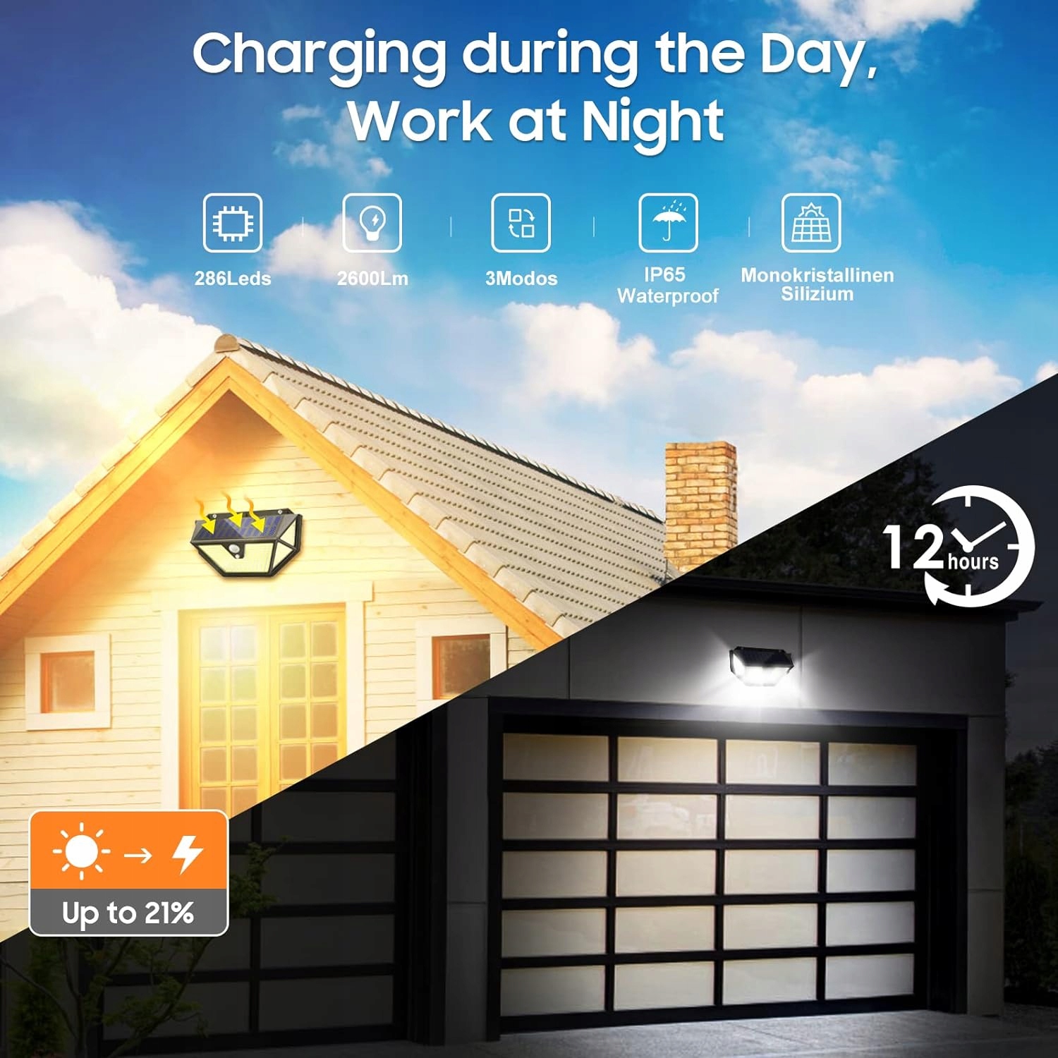 Зовнішні сонячні ліхтарі з датчиком руху 3 режими Зовнішні сонячні ліхтарі 286 Світлодіодна сонячна лампа зовнішня IP65 Водонепроникна сонячна лампа 270° Надяскрава сонячна лампа для садового гаража [2 штуки в наборі] [Клас енергоспоживання A] h1>- 286 світлодіодів і широкий кут 270°]Завдяки 286 світлодіодним намистинам (6500K) і ширококутному дизайну 270° ці зовнішні сонячні ліхтарі можуть забезпечити надзвичайно яскраве освітлення великої площі, достатнє для для ваших потреб у нічному освітленні.