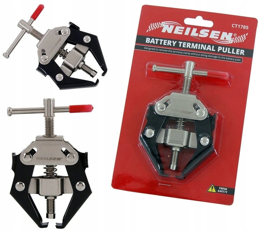 Призначений для зняття клемного затискача, не пошкоджуючи штирь акумулятора. Щоб використовувати, просто послабте затискний гвинт, потім розташуйте затискачі під кожною стороною та скористайтеся центральним гвинтом, щоб від’єднати затискач.