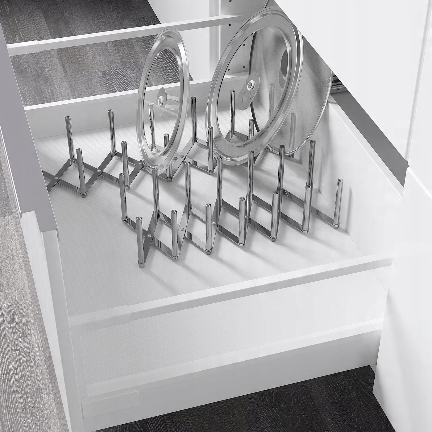 З відділенням для кришки VARIERA з нержавіючої сталі ваша кухня стане більш організованою та функціональною. Ви не лише підтримуватимете порядок у кришках каструль, але й матимете спокійнішу атмосферу під час приготування їжі. Також використовуйте цей практичний органайзер, щоб зберігати кришки харчових контейнерів, щоб уникнути безладу.