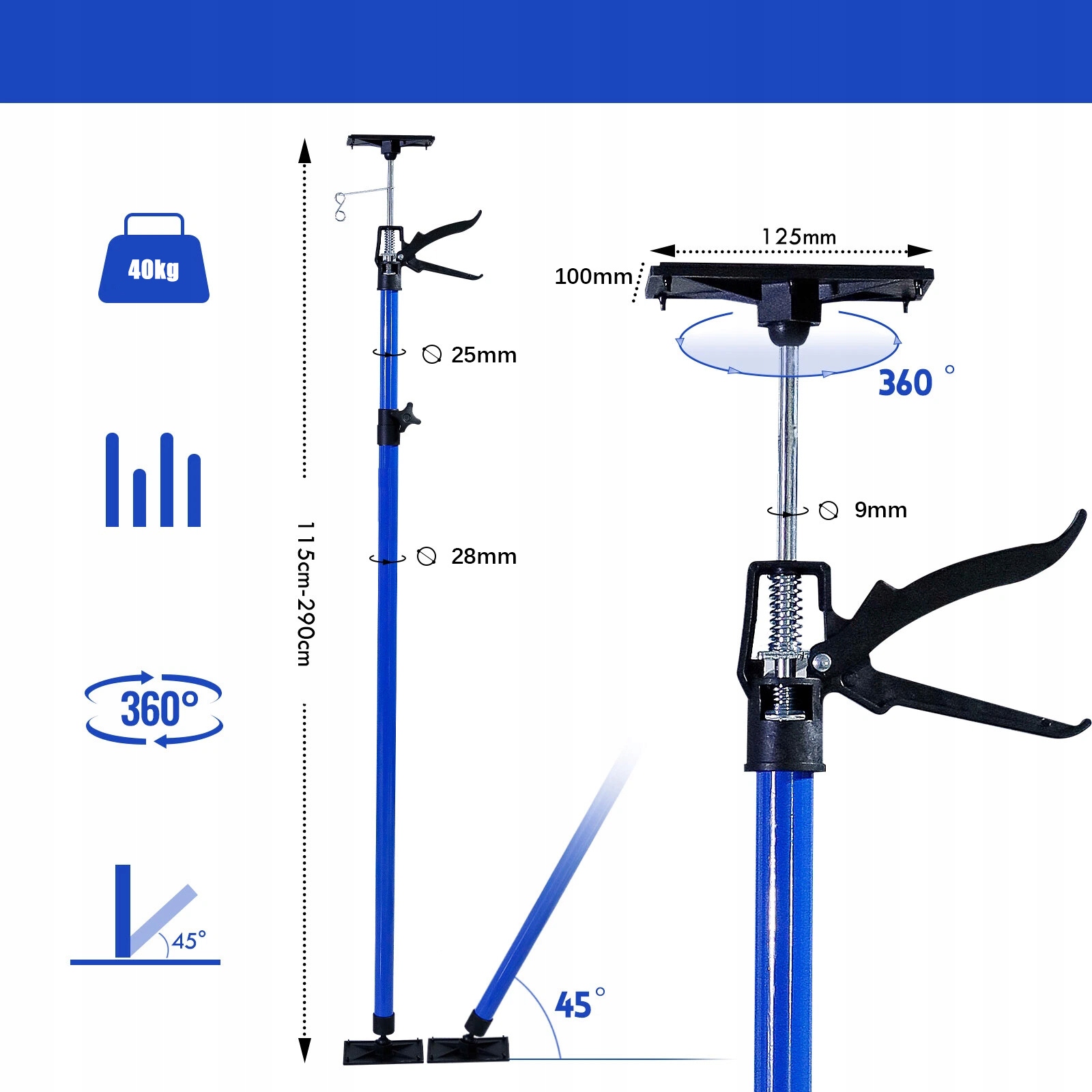 Телескопічна опора (115-290 см) з регулюванням довжини за допомогою механізму подовження та надування, керування однією рукою, вантажопідйомність до 40 кг.