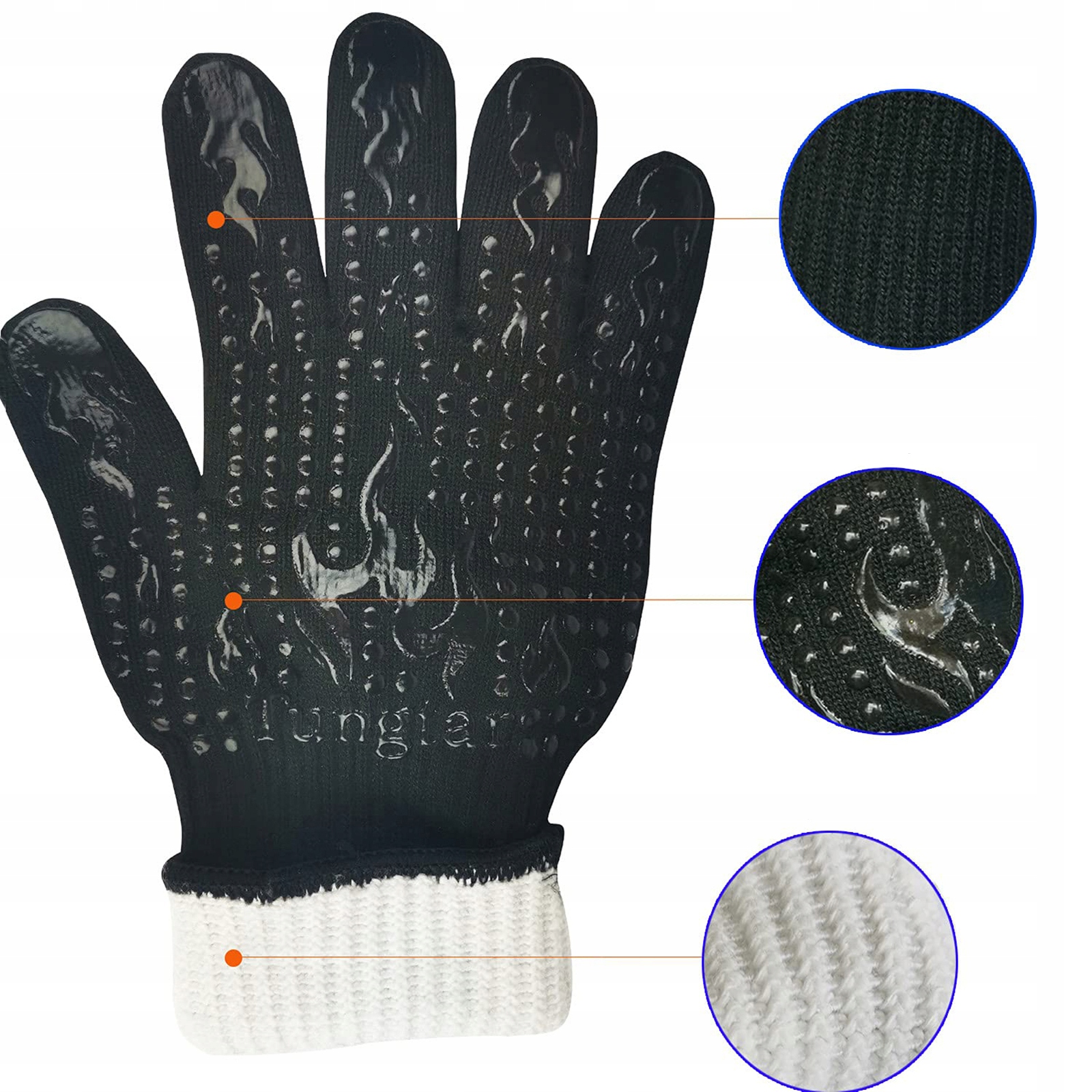 Універсальне використання: багатофункціональні рукавички для гриля: ці рукавички для гриля мають не тільки чудову термостійкість, теплоізоляцію та розсіювання тепла, але також стійкі до порізів, зносостійкість і дуже довговічні, що ідеально підходить для гриля, випікання та інших видів діяльності, що вимагають високих температур.