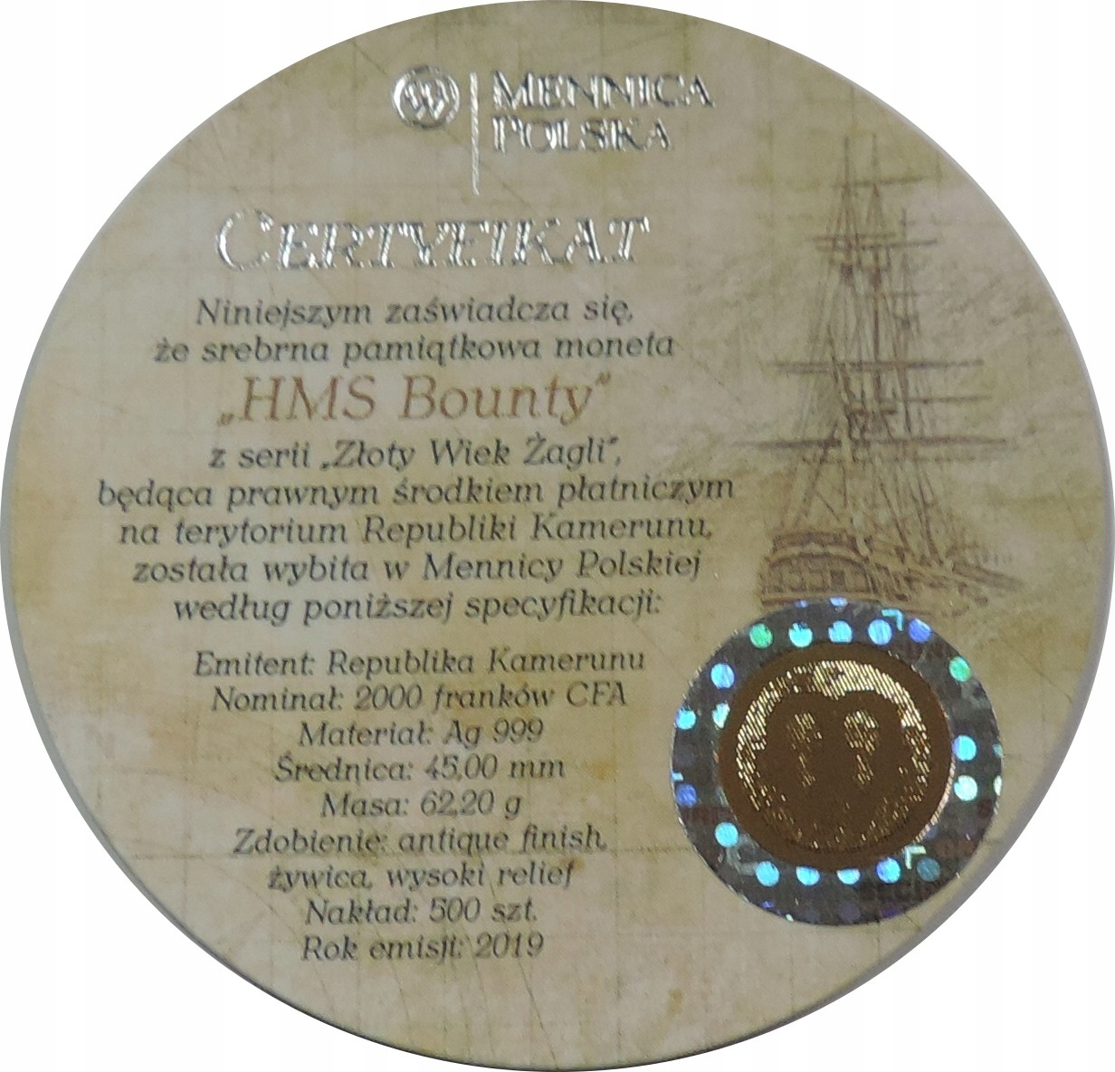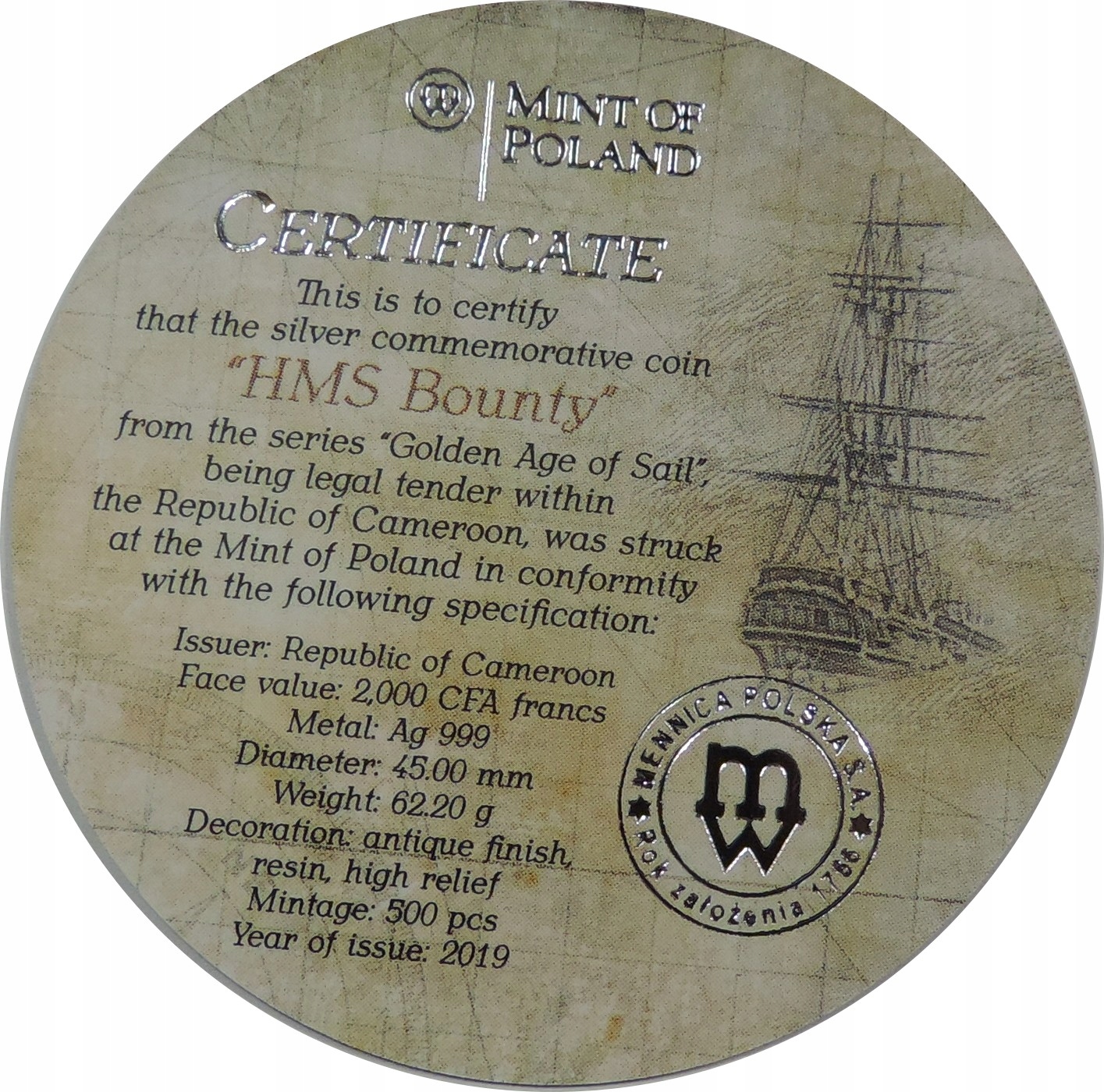 2 UNCJE Ag999 - 2000 FRANKÓW 2019 KAMERUN - ŻAGLOWIEC - HMS BOUNTY -MKR28