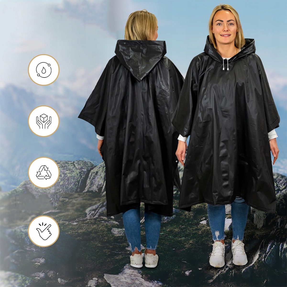– виготовлений із 100% екологічно чистого матеріалу EVA, нетоксичний і дихаючий. Цей плащ багаторазовий, швидко висихає та стійкий до розривів порівняно з плащами з ПВХ.