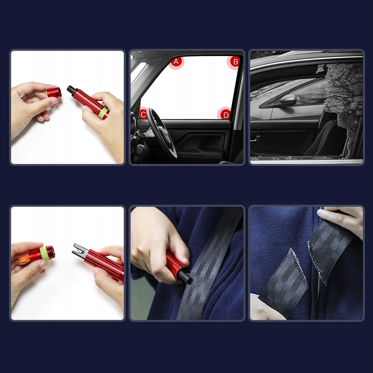 Цей аварійний молоток із ножем для розбивання ременів безпеки поєднує в собі розбійник вікон із вольфрамової сталі (20 кгс) і прихований розріз ременя безпеки. Головка молотка вискакує тільки при натисканні, в іншому випадку вона прихована - безпечна. Автомобільний аварійний молоток із різаком ременя безпеки допомагає в надзвичайних ситуаціях, наприклад у розбитих вікнах