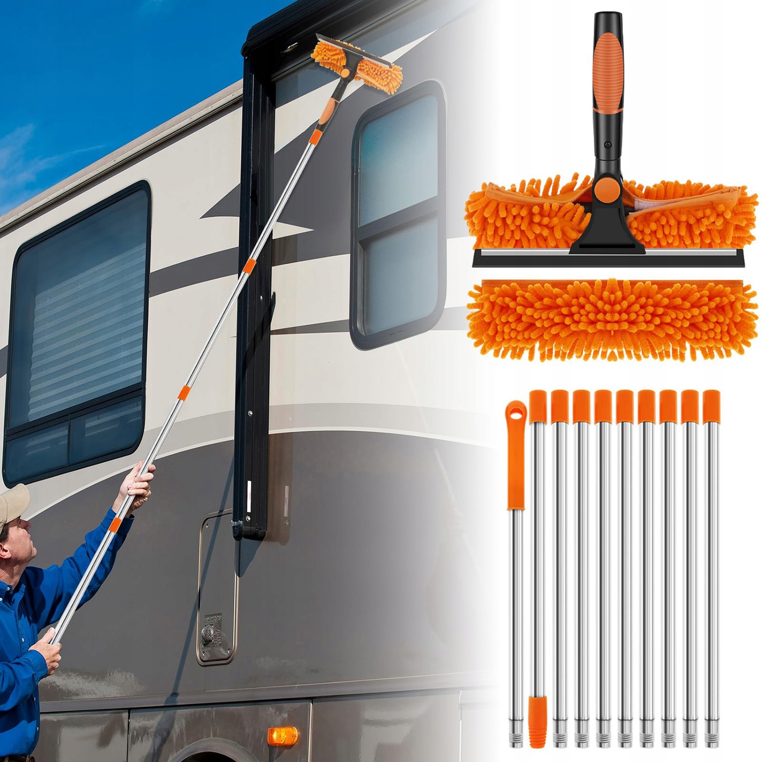 【Покращена подовжуюча палиця】: ця потовщена подовжувальна палиця має 10 знімних палиць, які зменшують навантаження на ваші руки та полегшують роботу. Додаючи або видаляючи стовпи, довжину можна регулювати до 424 см, що дозволяє легко чистити без драбини чи допомоги.