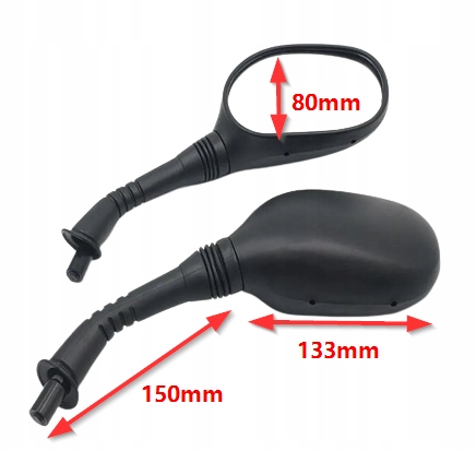 Універсальні мотоциклетні дзеркала чорного кольору, сумісні з багатьма моделями мотоциклів завдяки використанню різьби M8. Вони мають обтічну форму, не створюють зайвого опору повітря, а велика дзеркальна поверхня забезпечує широке поле огляду. Виготовлений з міцного пластику. У наборі 2 шт.