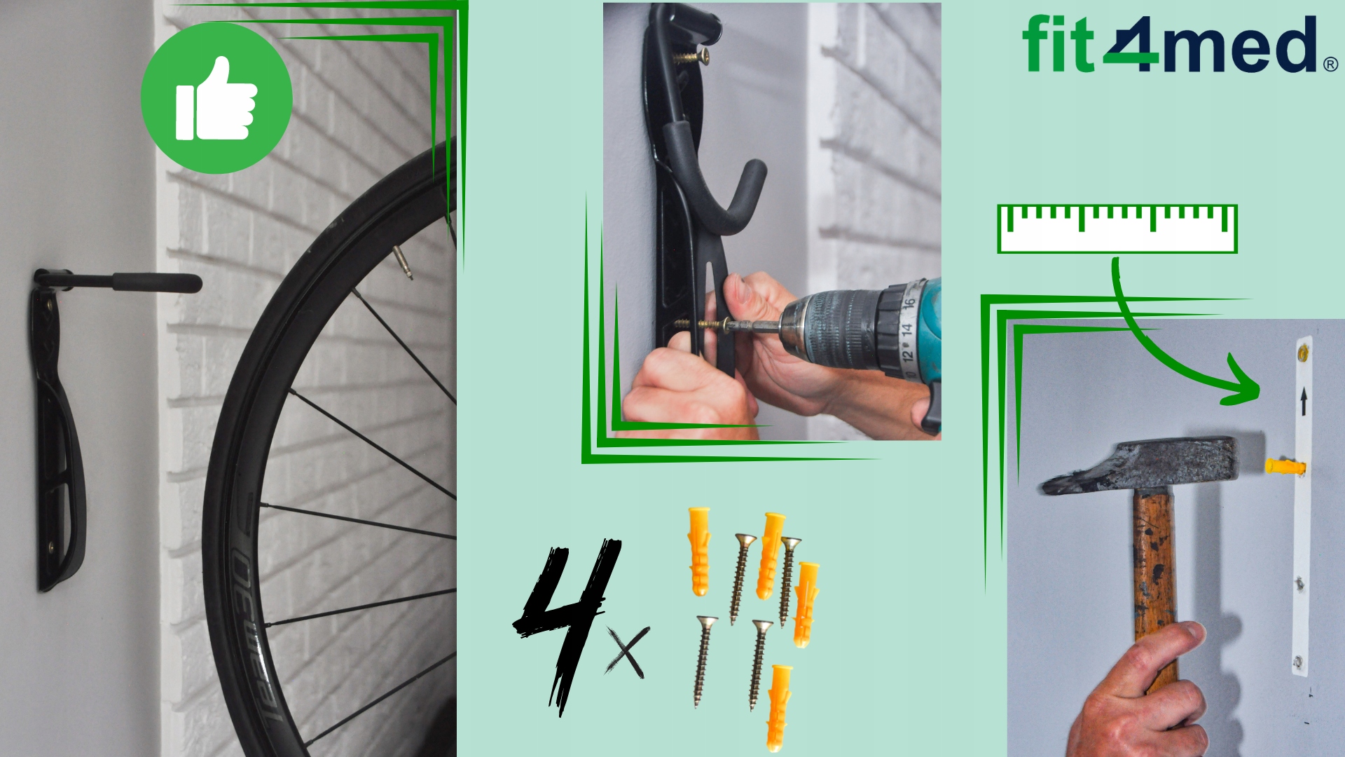 ✅Тримач кріпиться до стіни за допомогою чотирьох розширювальних дюбелів, які є в нашому наборі. Кріплення за допомогою 4 шпильок набагато стабільніше, ніж інші вішалки, встановлені двома штифтами. Тримач легко витримує вагу велосипеда до 30 кг. Додатково в набір входить самоклейка, яка полегшить точне свердління отворів.