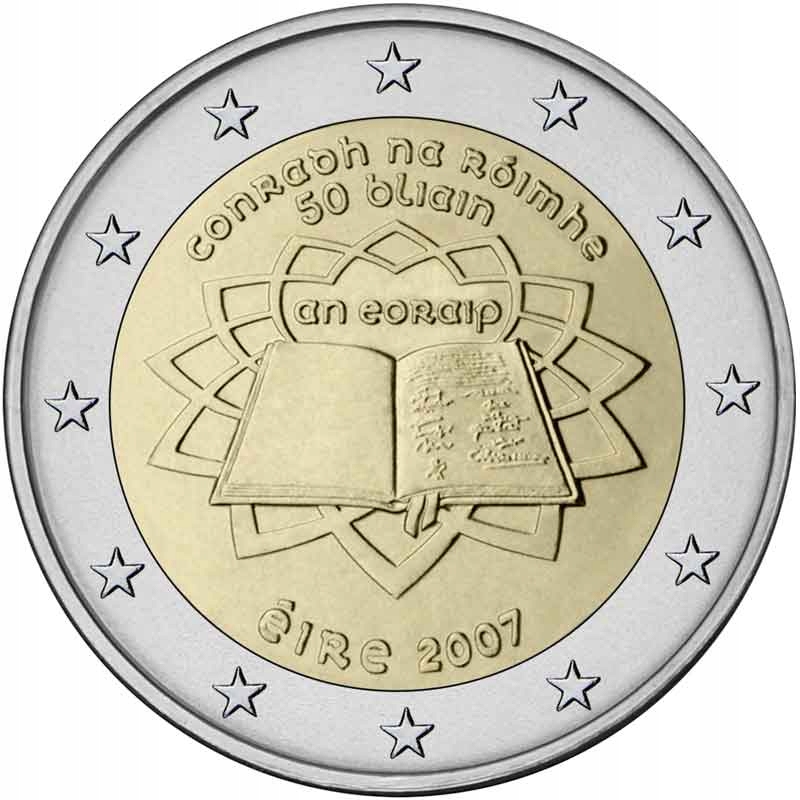 Опис: Монета представляє договір, підписаний шістьма країнами -засновниками на фоновому режимі, що нагадує тротуар, розроблений Мікеланджело на П'яцці -дель -Кампідогліо в Римі, де договір був підписаний 25 березня 1957 року. Над мотивом існують субтитри "50 років римського договору" та "Європи", а під ним назва єврозони, що випромінює дану монету на своїх офіційних мовах чи латині. Таким чином, написи на монетах окремих країн різні, але тема однакова. Римський договір створив Європейське економічне співтовариство, що в результаті призвело до євро як валюти в 1999 році та введення банкнот та монет євро в грошовий тираж у 2002 році. Річниця підписання договору падає 25 березня 2007 року. Країни Євро -району вирішили відзначити сьогодні з спільною емісією дорічної монети. Зображення монет був обраний у змаганнях, організованому європейським монетним двором.