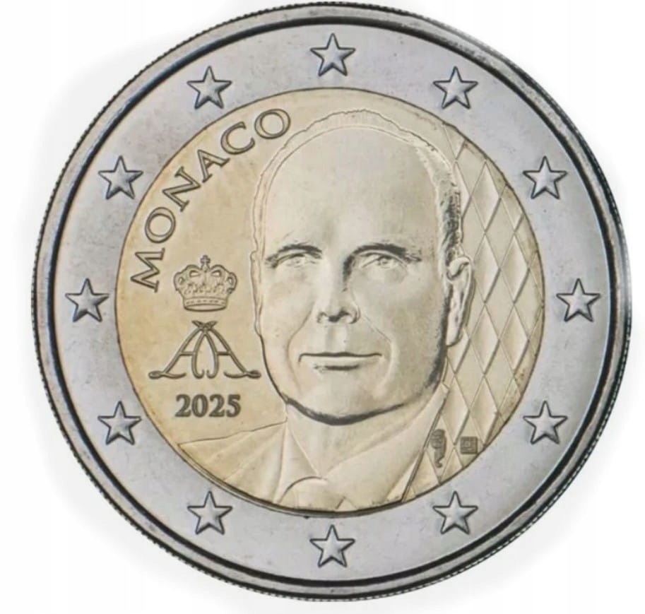 У центральному місці ми бачимо реалістичний портрет принца Альберта II, представлений із серйозністю та спокоєм, характерними для монет, випущених Князівством Монако. З лівого боку розміщено герб із короною та княжий вензель — стилізовані літери «А» з королівською короною, що підкреслює офіційний характер випуску. Тло композиції заповнене геометричним мотивом ромбів, характерним для Монако, що відсилає до геральдики династії Грімальді. Унизу рік випуску 2025. Весь оточений дванадцятьма зірками Європейського Союзу.