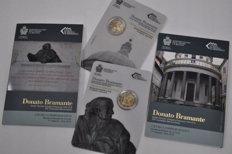 Опис: На монеті зображено портрет Браманте та частину Tempietto (італ. малий храм) – каплиця, збудована ним у 1502 р. на подвір’ї церкви св. Петра в Монторіо, вважається шедевром епохи розквіту італійського Відродження. Цей дизайн майже повністю оточений іменем архітектора «BRAMANTE LAZZARI DELLE PENNE DI SAN MARINO». Роки «1514» і «2014» з'являються зліва і справа відповідно. У нижній частині монети розташовані ініціали художниці Марії Кармели Коланері «MCC» і знак монетного двору. Навколо монети зображено 12 зірок Європейського Союзу.