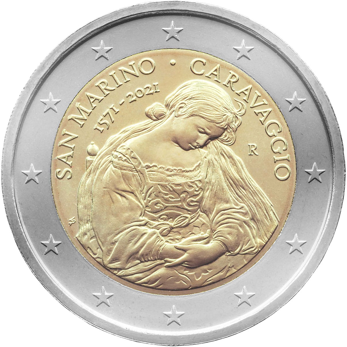 Опис:Основний мотив монети — розкаяна Марія Магдалина з однойменної роботи Караваджо, яка знаходиться в галереї Доріа Памфілі в Римі. У лівій верхній частині можна побачити напис «SAN MARINO», а внизу – роки «1571-2021». Зліва розміщено ініціали автора Сільвії Петрассі «SP», а у верхній правій частині — напис «CARAVAGGIO» та знак монетного двору. Навколо монети зображено 12 зірок прапора Європейського Союзу.
