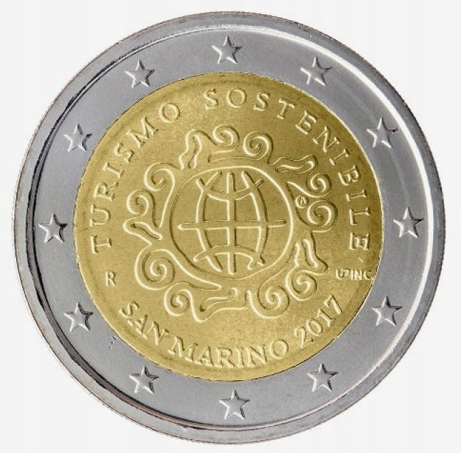 Рішенням Генеральної Асамблеї ООН 2017 рік оголошено Міжнародним роком сталого туризму для розвиток. Концепція сталого туризму полягає в тому, щоб подорожувати з повагою до нашої планети таким чином, щоб це не змінювало природне, соціальне та мистецьке середовище та не перешкоджало розвитку соціальної та економічної діяльності. Сталий туризм протилежний масовому туризму і зазвичай підтримує найслабшу економіку. Республіка Сан-Марино присвятила цій темі пам’ятну монету в 2 євро, розроблену канадським художником Ендрю Льюїсом, щоб сприяти новому мисленню та заохочувати туристів поважати навколишнє середовище. Навколо монети зображено 12 зірок Європейського Союзу.