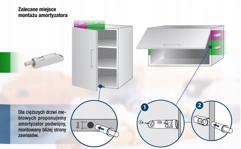 Невеликі розміри і діаметр лише 8 мм дозволяють легко встановити амортизатор, як використовують додатковий адаптер, так і свердління отвору в корпусі меблів.