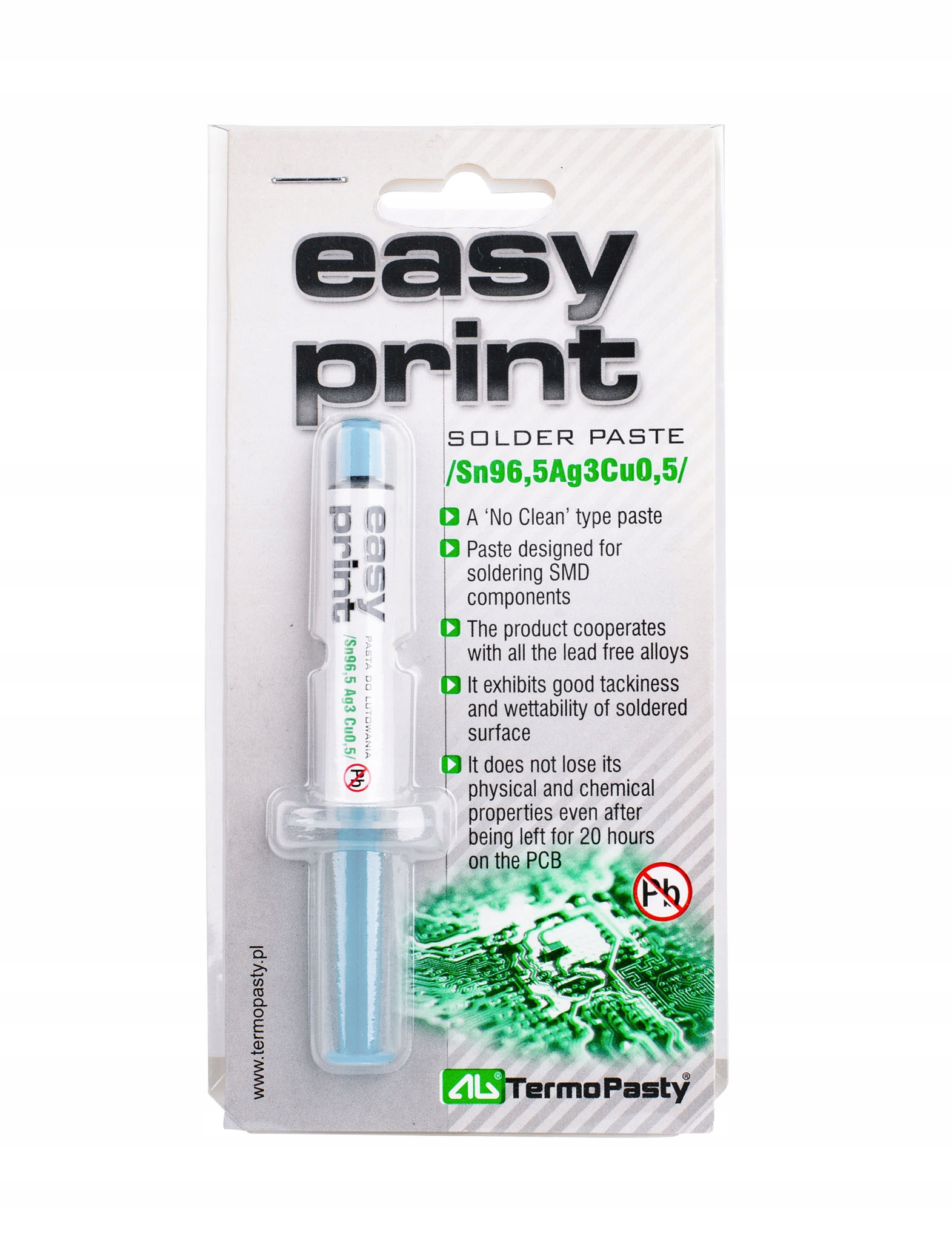Easy Print Sn96.5Ag3Cu0.5 від AG Termopasty - це паста, призначена для пайки SMD компонентів у виробничих процесах, які не включають фази промивання. На основі флюсу No Clean, який не вимагає миття і залишки якого не викликають корозії. Продукт працює з усіма безсвинцевими сплавами і характеризується хорошою адгезією і змочуваністю спаяної поверхні. Він не втрачає своїх фізико-хімічних властивостей навіть після 20 годин перебування на друкованій платі.