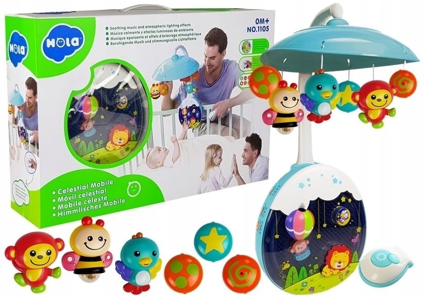 в Somb, що розробляються, звучать, схоже на те, що стосується живота Конструкція каруселі пластикова і дуже барвиста . Підвіски у формі тварин, тобто мавпи, птахів та бджіл, знімні, можуть служити дитині як незалежні іграшки.
