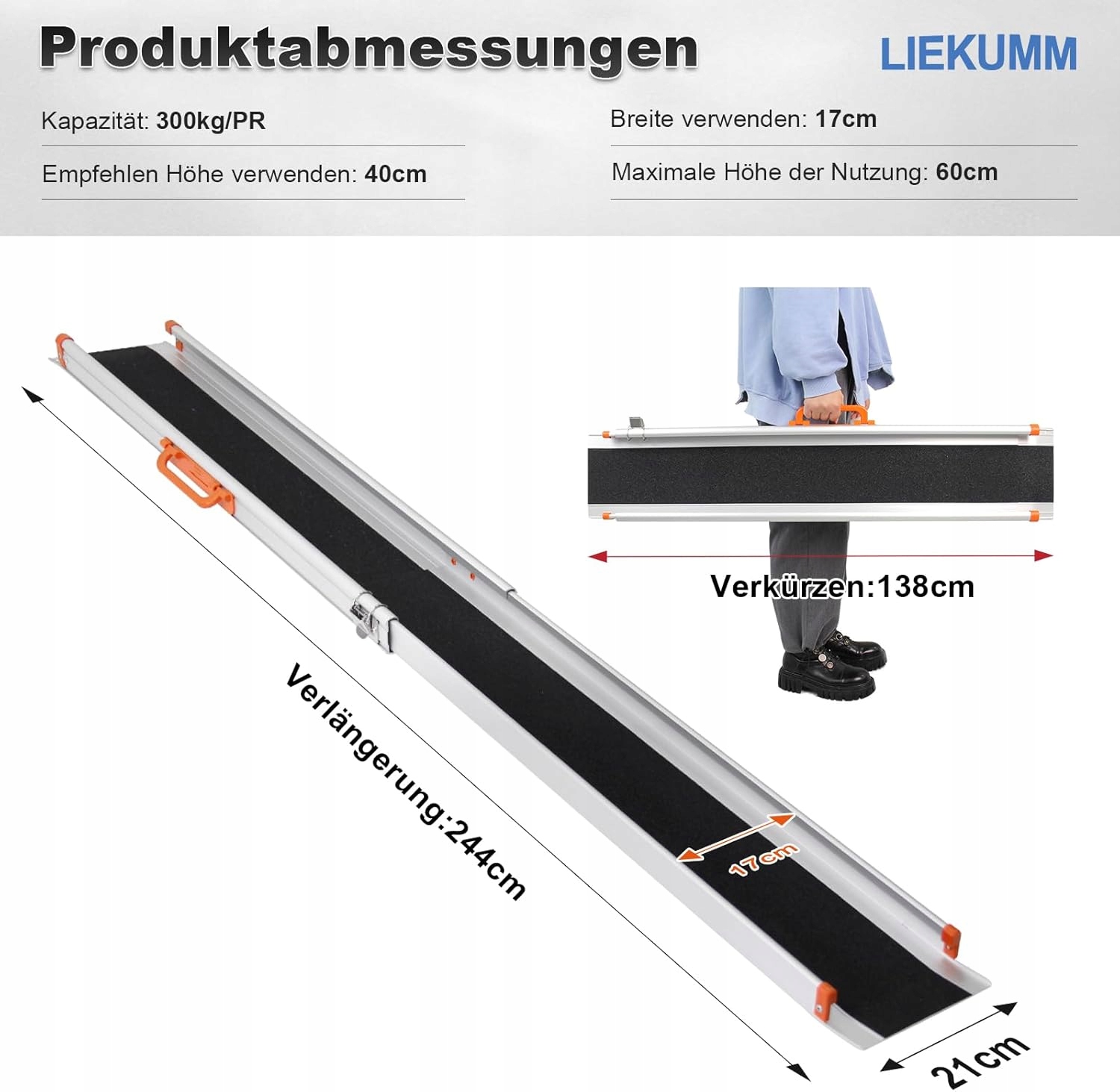 - міцний алюміній: Міцна алюмінієва конструкція має вантажопідйомність 300 кг і ідеально підходить для скутерів та штовханих інвалідних візків.