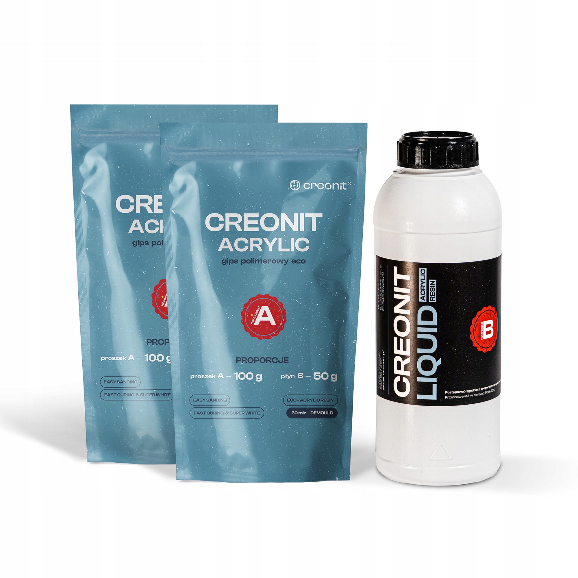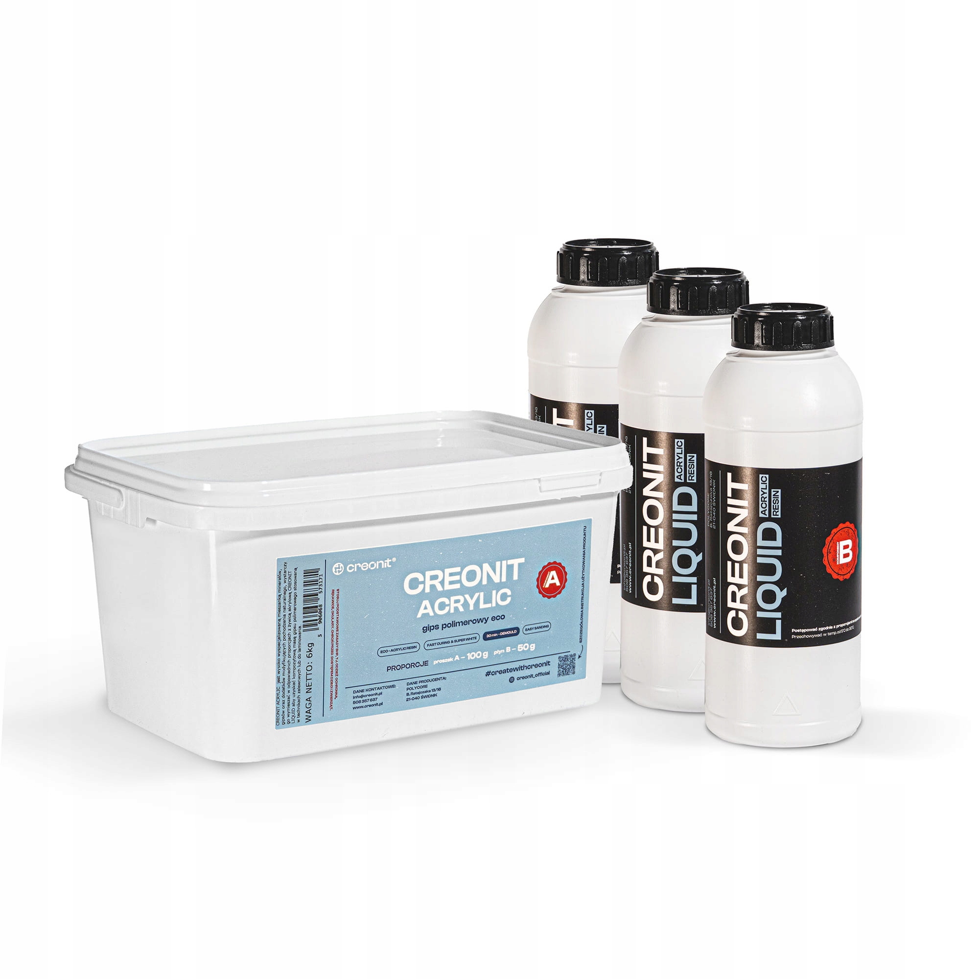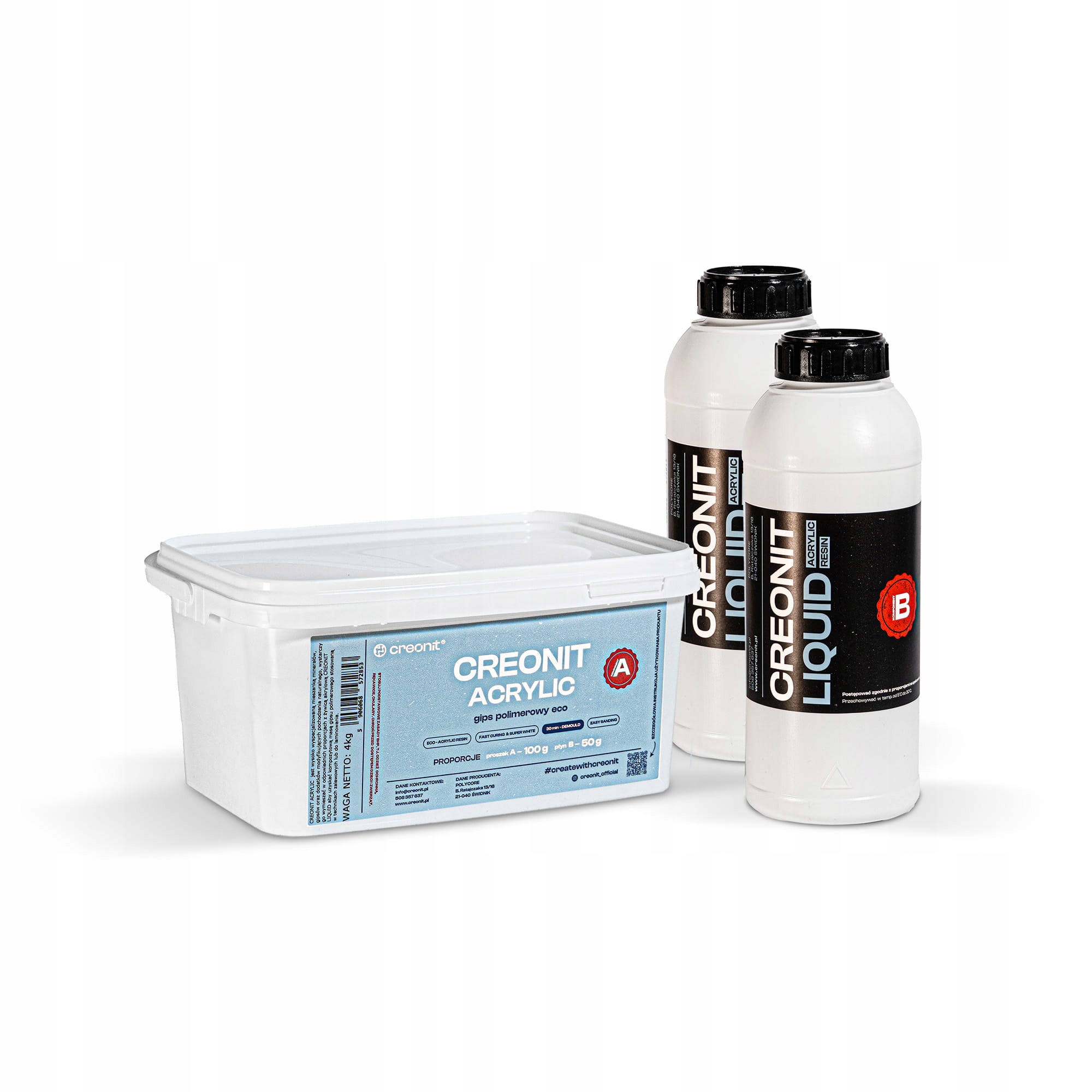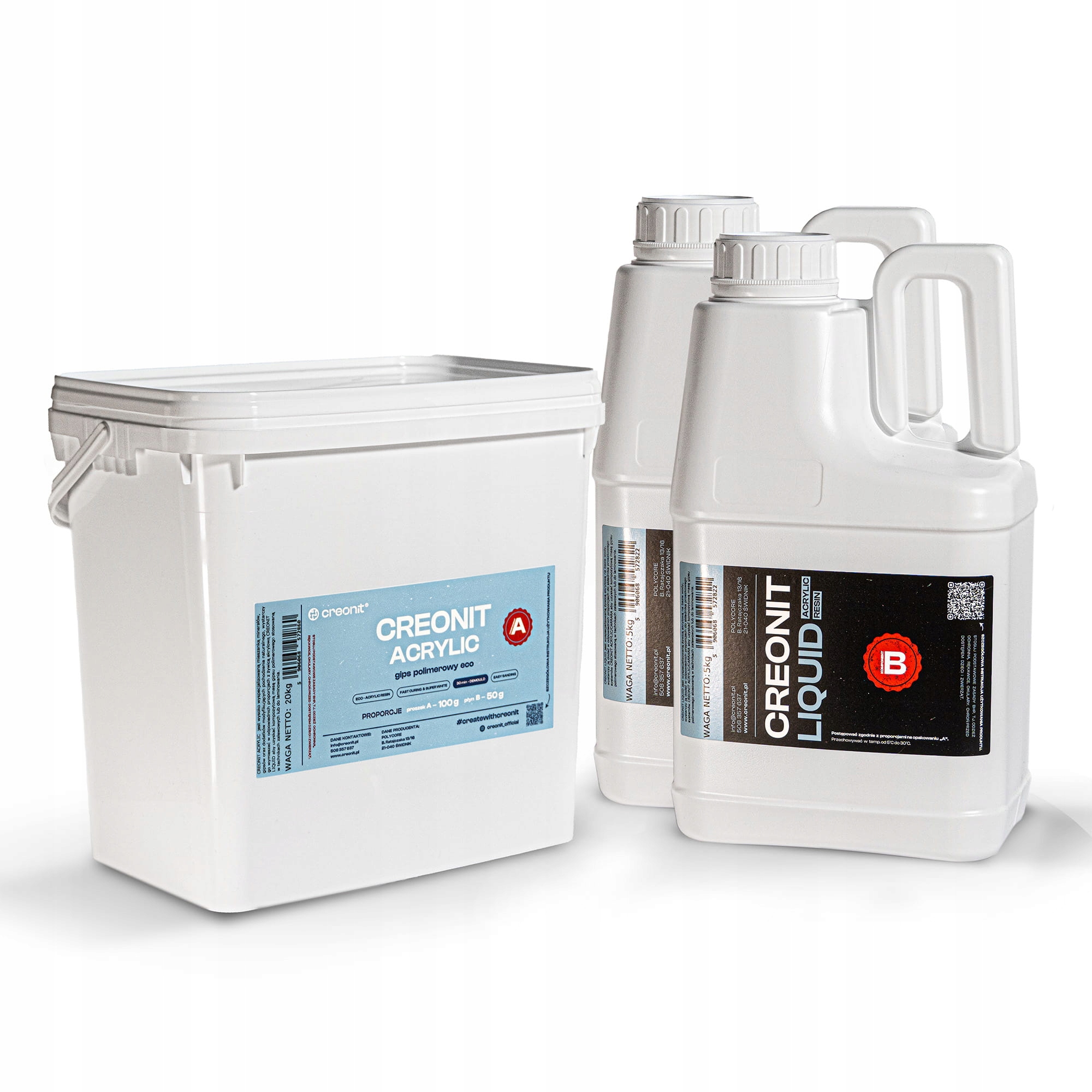 Creonit Acrylic -це двокомпонентна смоляна система на основі порошкового компонента, яка є вузькоспеціалізованою сумішшю мінералів, штукатурки та добавок, що змінюють природне походження та акрилову смолу на основі води. Ці типи систем часто називають полімерною штукатуркою або просто двоконпонентною акриловою смолою. Внаслідок поєднання цих двох інгредієнтів ми отримуємо масу повені, з якої ми утворюємо композит з високою механічною міцністю, температурною стійкістю та стійкістю до УФ. Creonit Acrylic характеризується простотою використання, а основа мінеральної порошку та смоли на основі води дають нам екологічно чистий матеріал та користувачеві. Ця система без запаху не містить розчинників, безпечна у використанні, не вимагає надзвичайних запобіжних заходів під час роботи. Виливки з креонного акрилу мають білий колір і мають дуже тверду і гладку поверхню. [Physic-хімічні властивості