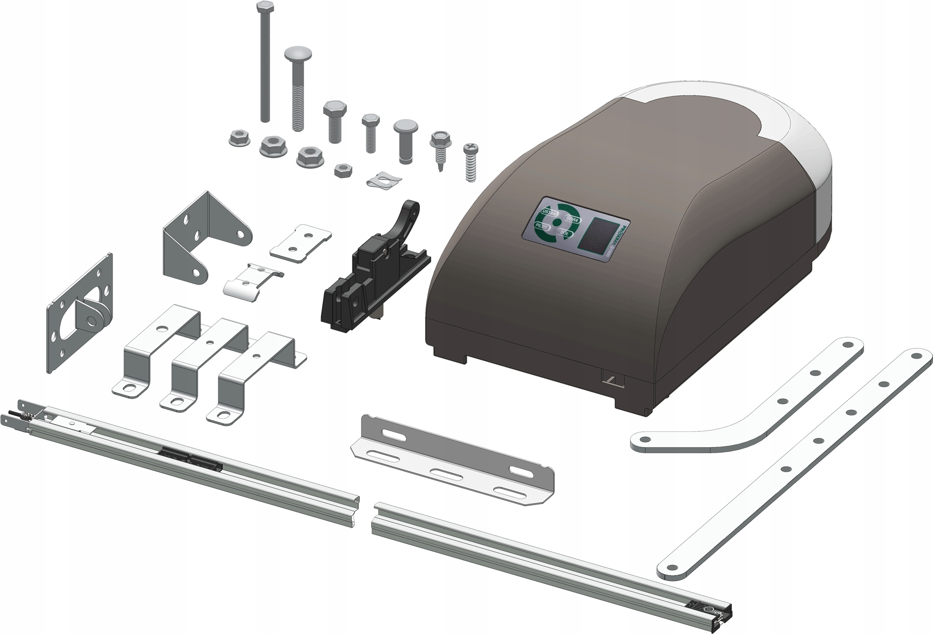 - УНІВЕРСАЛЬНІСТЬ Сфера використання забезпечується сталевою передавальною рейкою, що входить до комплекту - її довжина до 4,2 м, що дозволяє автоматизувати секційні ворота висотою до 3,5 м. Сталева конструкція профілю рейки забезпечує високу жорсткість при передачі навантаження.