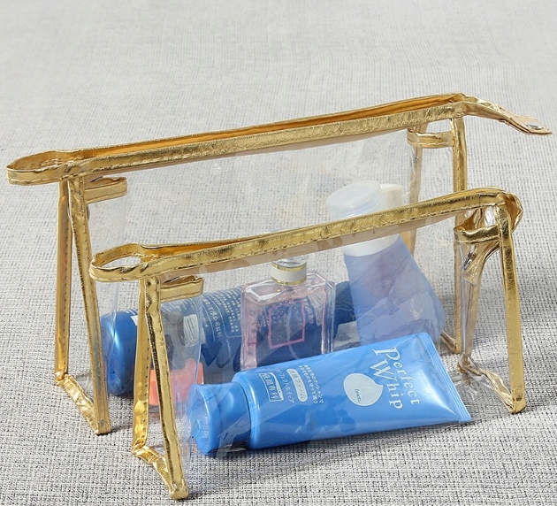 Набір складається з 2 різних розмірів прозорих косметологів із золотим кордоном. Клядці закриті на блискавці. Легко в чистоті, водонепроникний. Вони можуть бути приховані в іншому, завдяки тому, що невикористані вони займають мало місця.