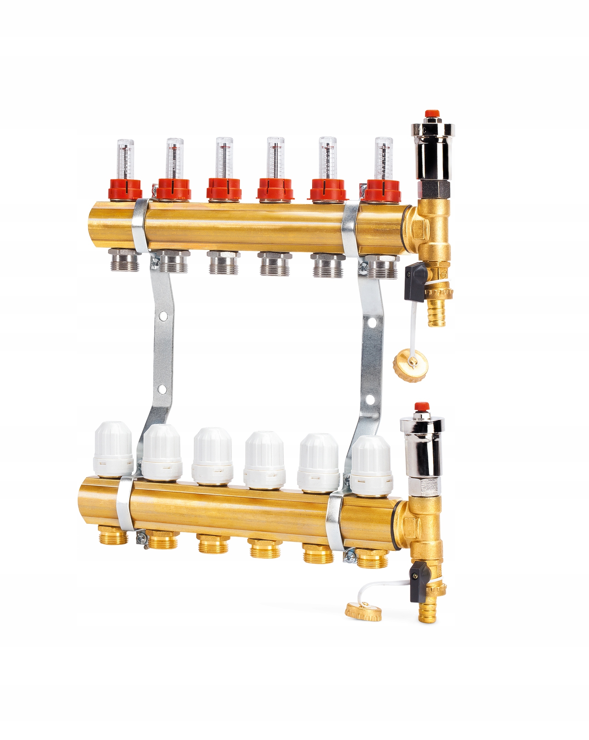 Верхня балка оснащена ротаметрами, які дозволяють точно регулювати потоки в контурах опалення.