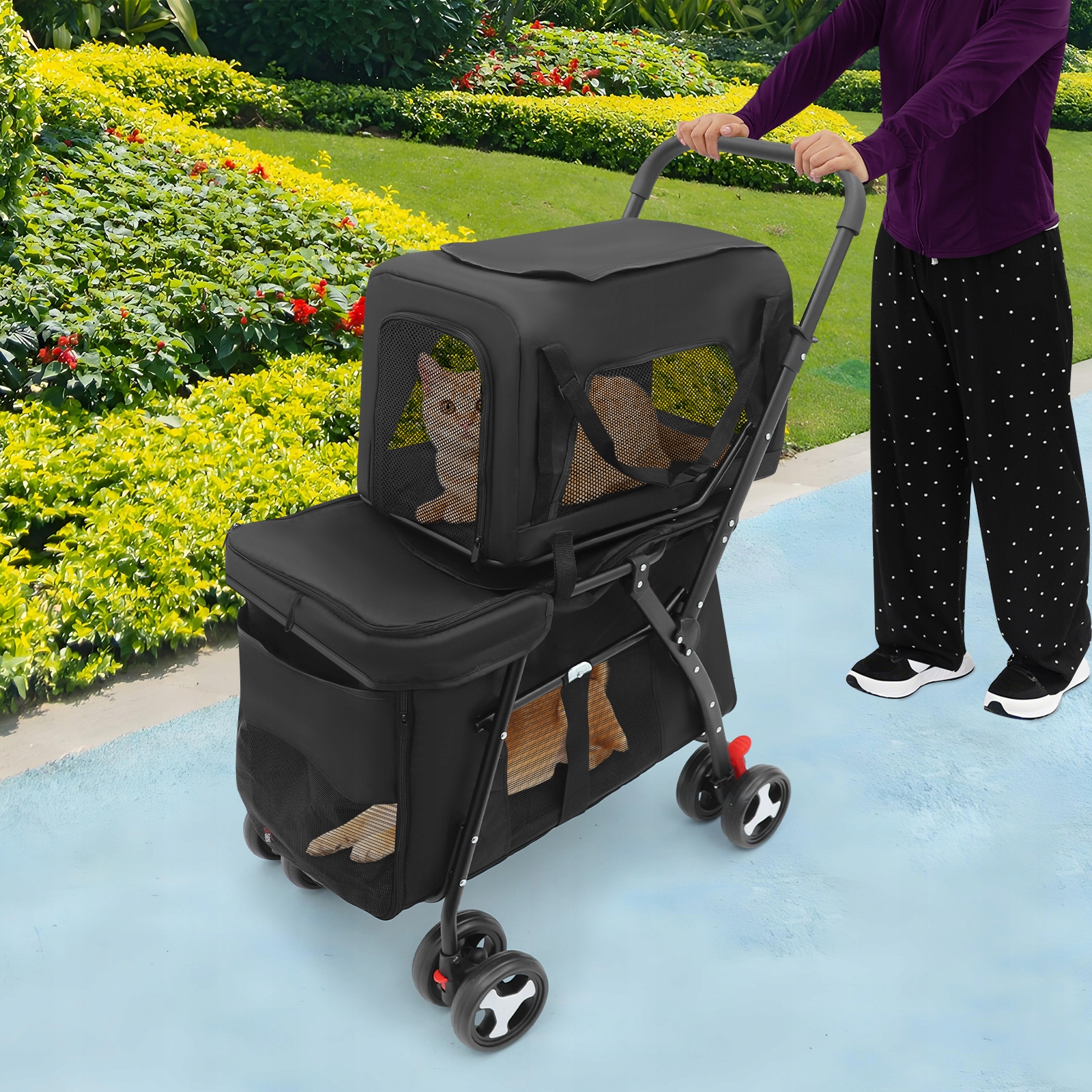 - Розширте приємні часи зі своїм пухнастим найкращим! Ця коляска для домашніх тварин — це все про веселі пригоди — чи то ви досліджуєте парк, чи зупиняєтеся в кафе, де допускаються домашні тварини, чи просто насолоджуєтеся прогулянкою у сонячний день. Завдяки зручній їзді та продуманому дизайну ваш вихованець почуватиметься затишно та безпечно, а ви насолоджуватиметеся плавним та легким керуванням у дорозі.