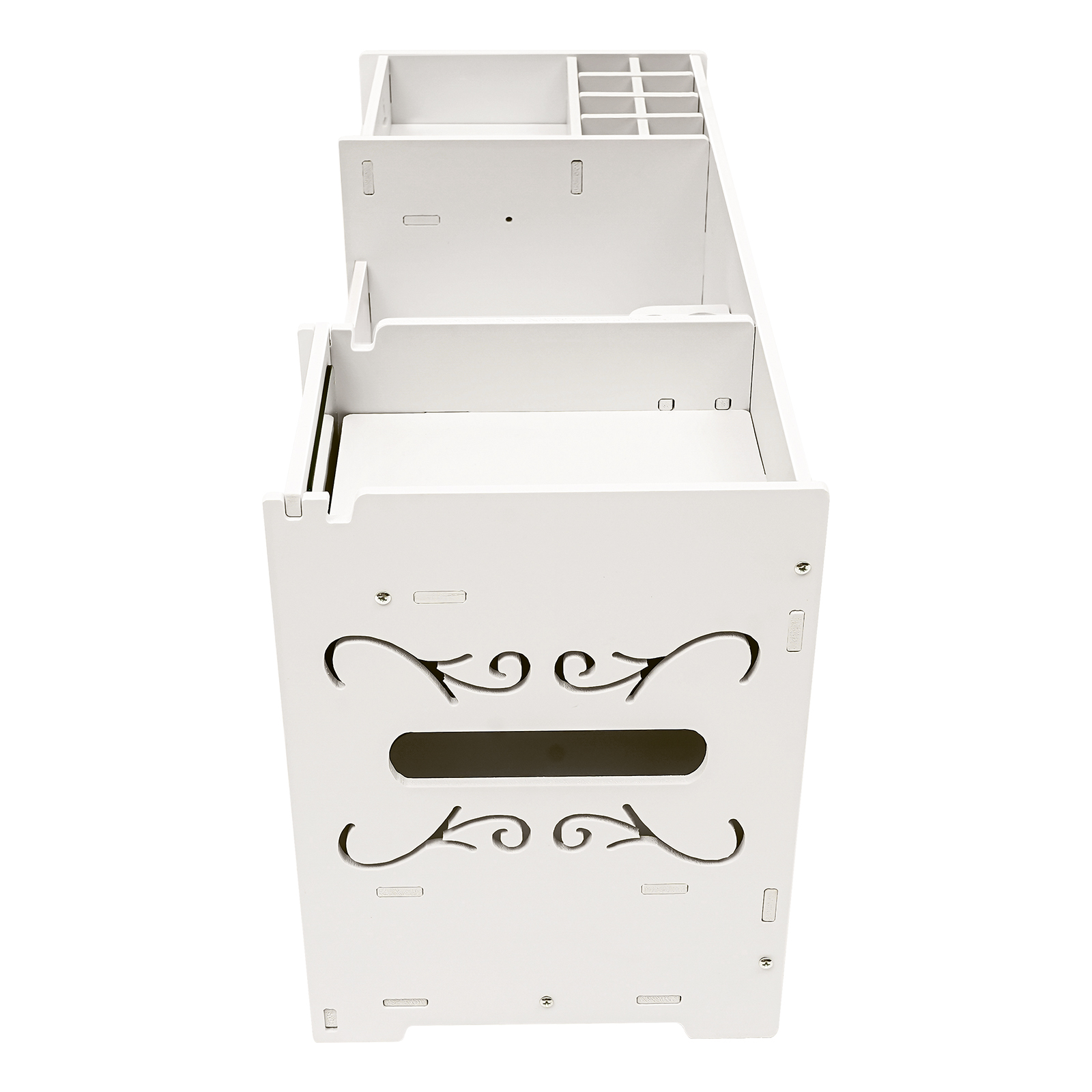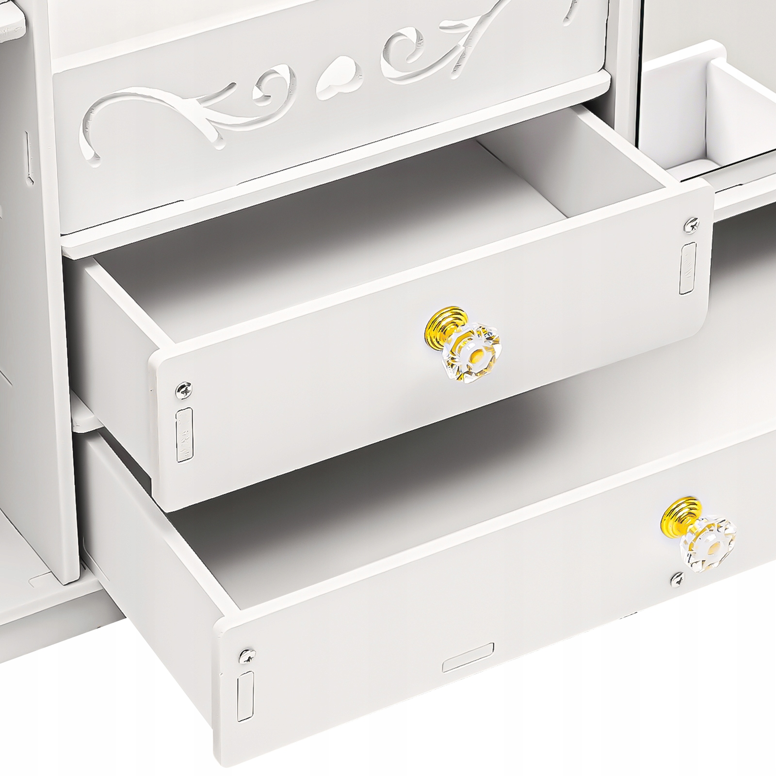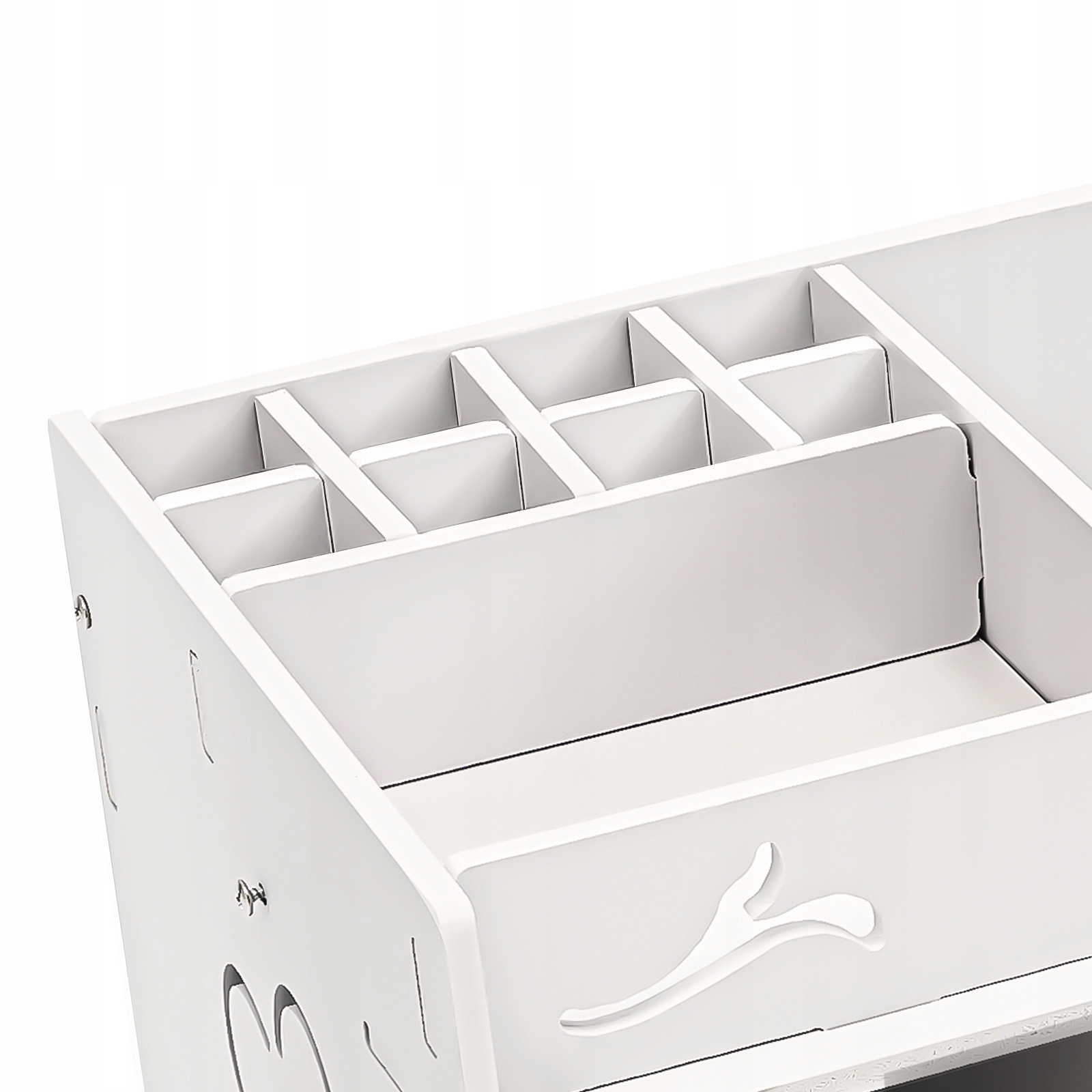 - Велике місце для зберігання: Шафа для зберігання з дверцятами та двома висувними ящиками різних розмірів дає достатньо місця для зберігання всіх видів косметики. Верхня полиця має необмежену висоту, тож ви можете розмістити високі пляшки із засобами для догляду за шкірою та пензликами для макіяжу, як забажаєте, для легкого доступу. Він також постачається з коробкою для серветок із великим отвором, призначеним для легкого вилучення серветок.